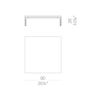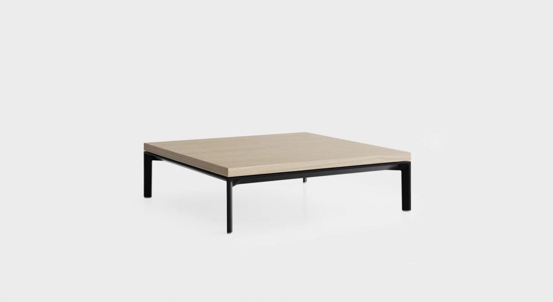 Tavolino con gambe angolari altezza 22 cm, in pressofusione di alluminio riciclato verniciato a polveri, con piedini in polietilene. Telaio in estruso di alluminio, unito ai quattro angoli con piastre in alluminio e viti in acciaio inox. Piani in MDF, spessore 30 mm, rivestiti in varie finiture.