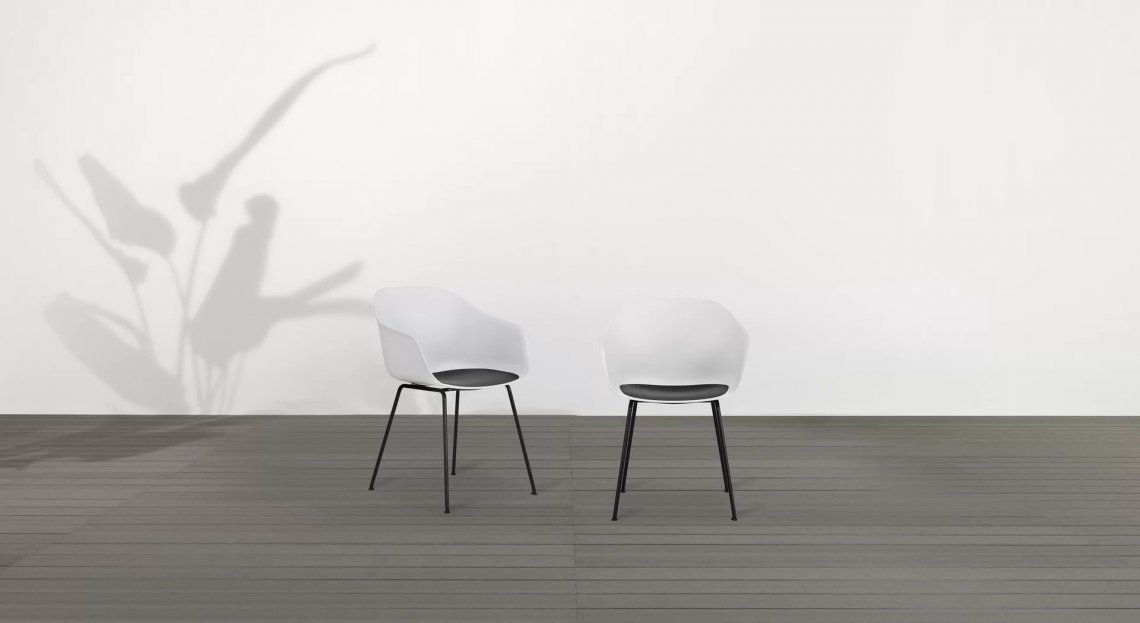 Base a 4 gambe in acciaio cromo satinato o verniciato a polveri. Piedini in nylon con feltro integrato.