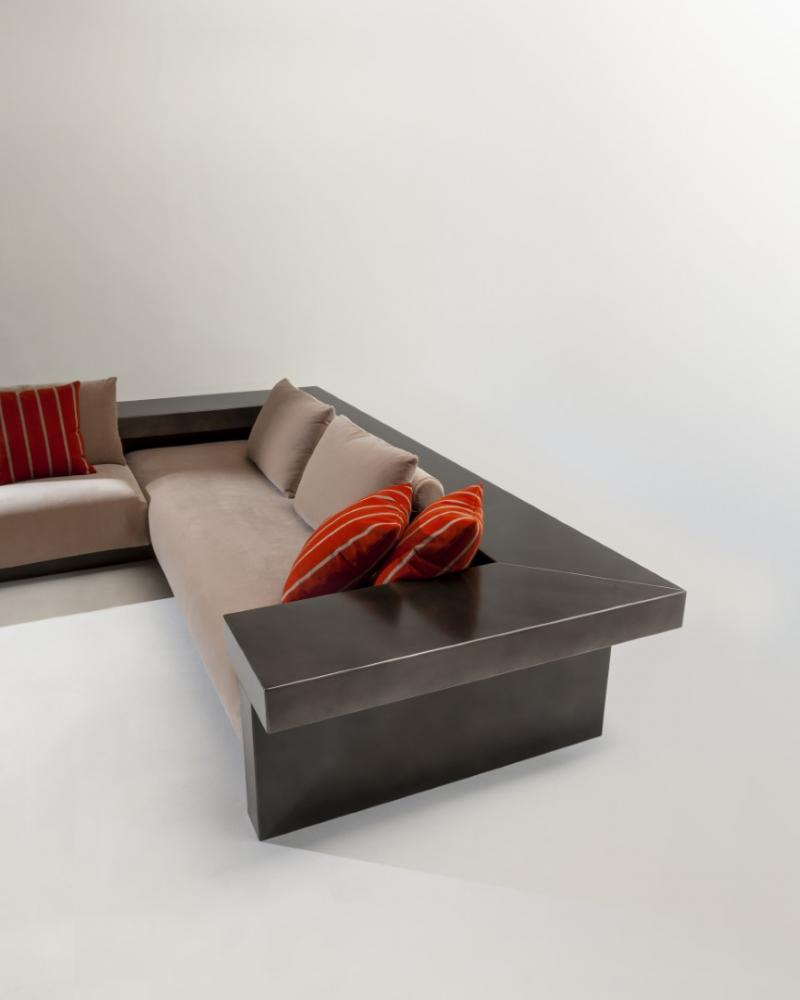 Characterized by wooden frame and armrests, available with a Delabré finish or covered by a lightweight marble slab. The armrests, available in various combinations and sizes, also serve as integrated tables.