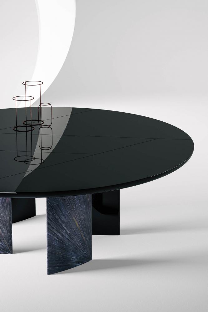 Table with rounded and inlaid top, and ovoid section legs. Available with marble, smooth wood or glossy lacquered top and with legs in smooth wood, glossy lacquered wood or lacquered with metallic paint, also covered with black rye straw inlay.