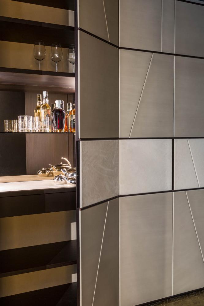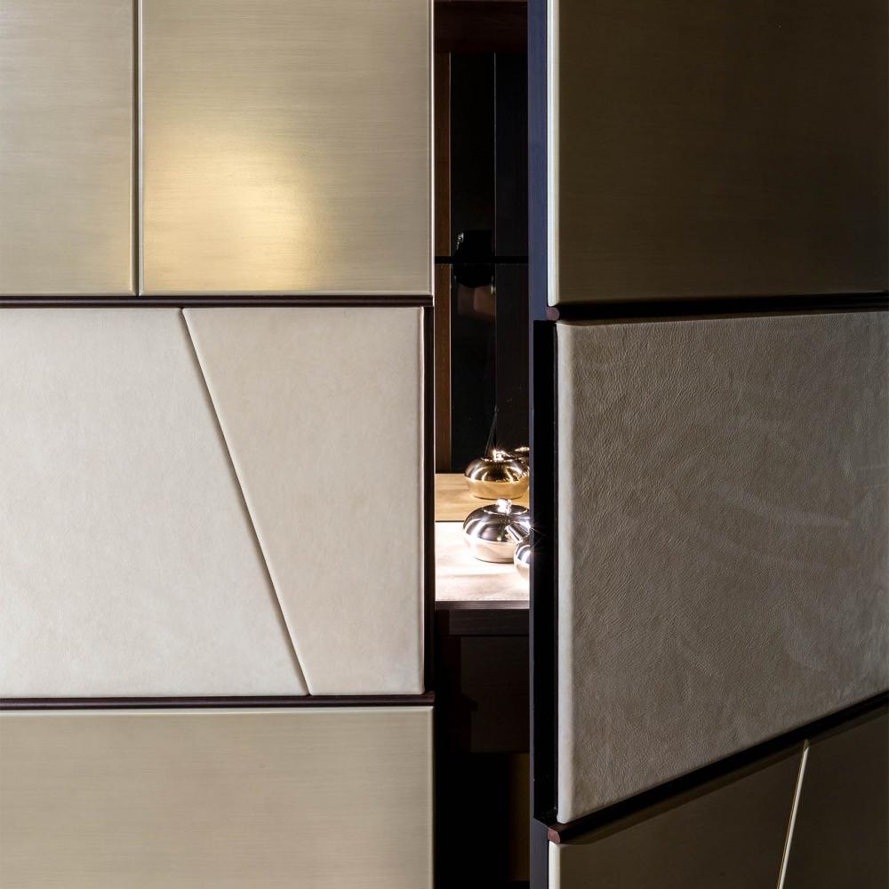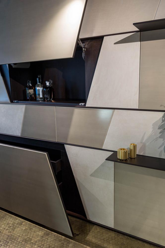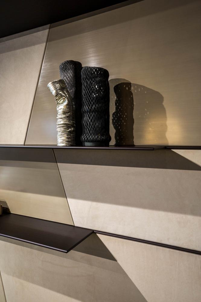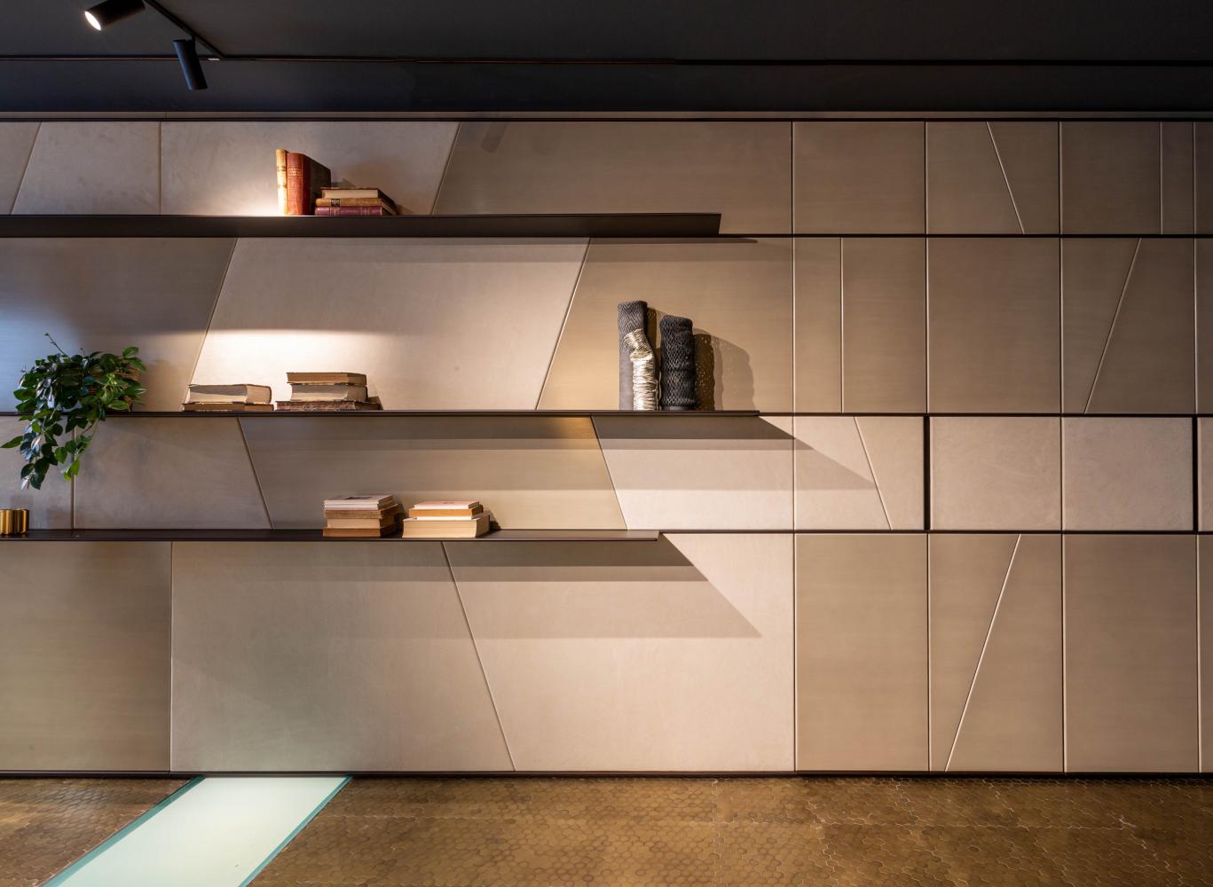 Terre day system perfectly integrates with the doors and panelling of the same collection, creating a play of trapezes, lozenges and rectangles, suitable for containing integrated hidden storage solutions such as wardrobes, drawers, shelves and bar cabinets.