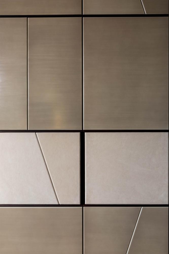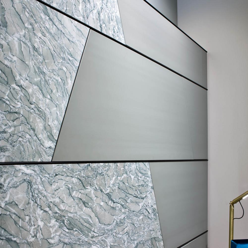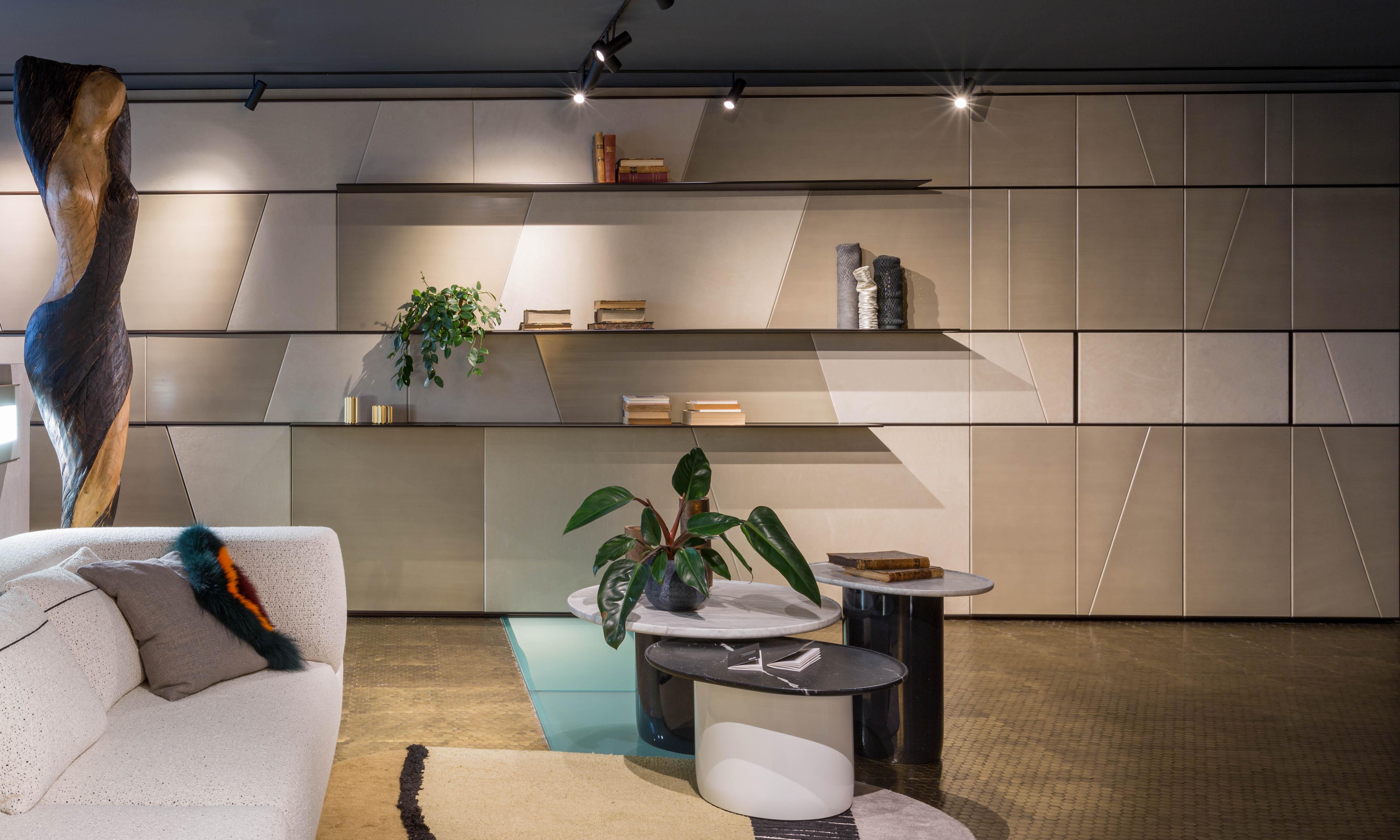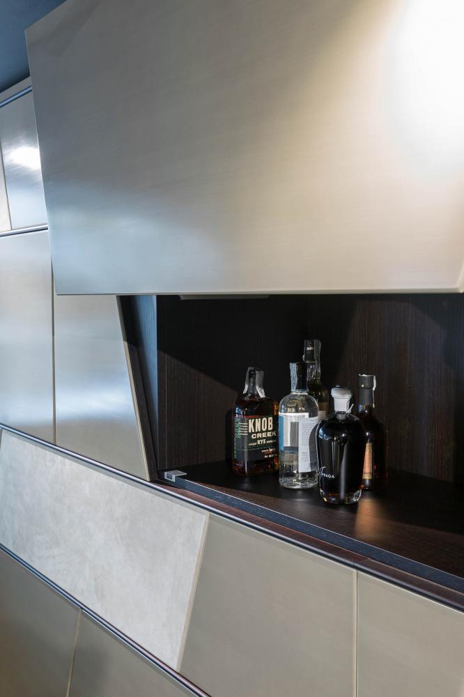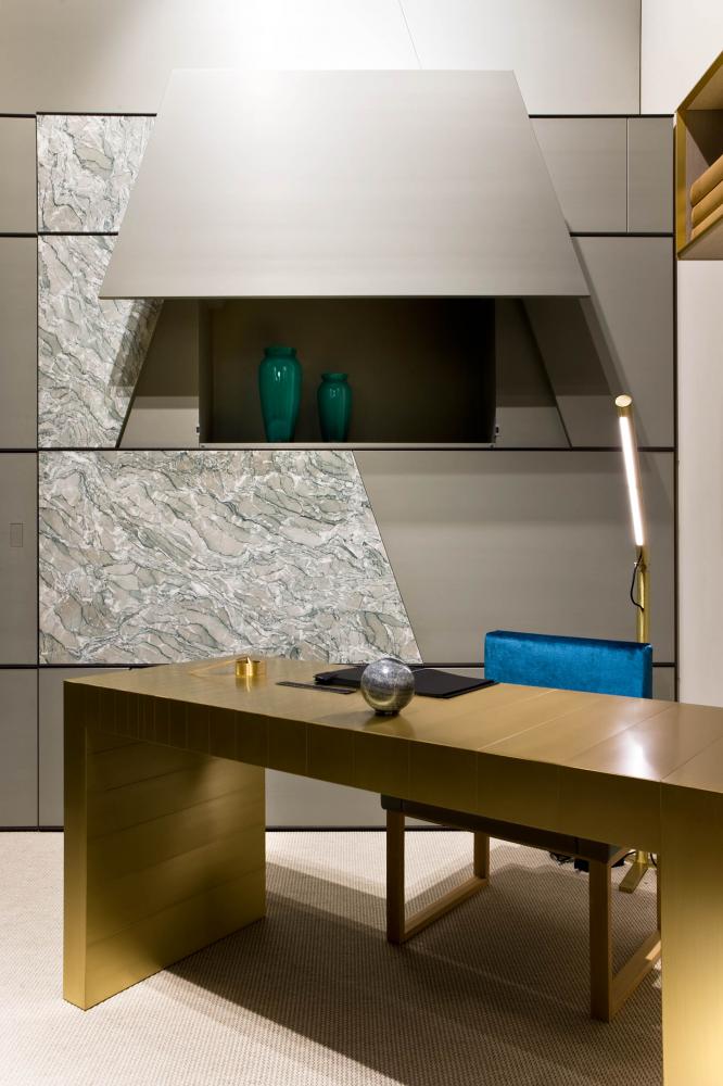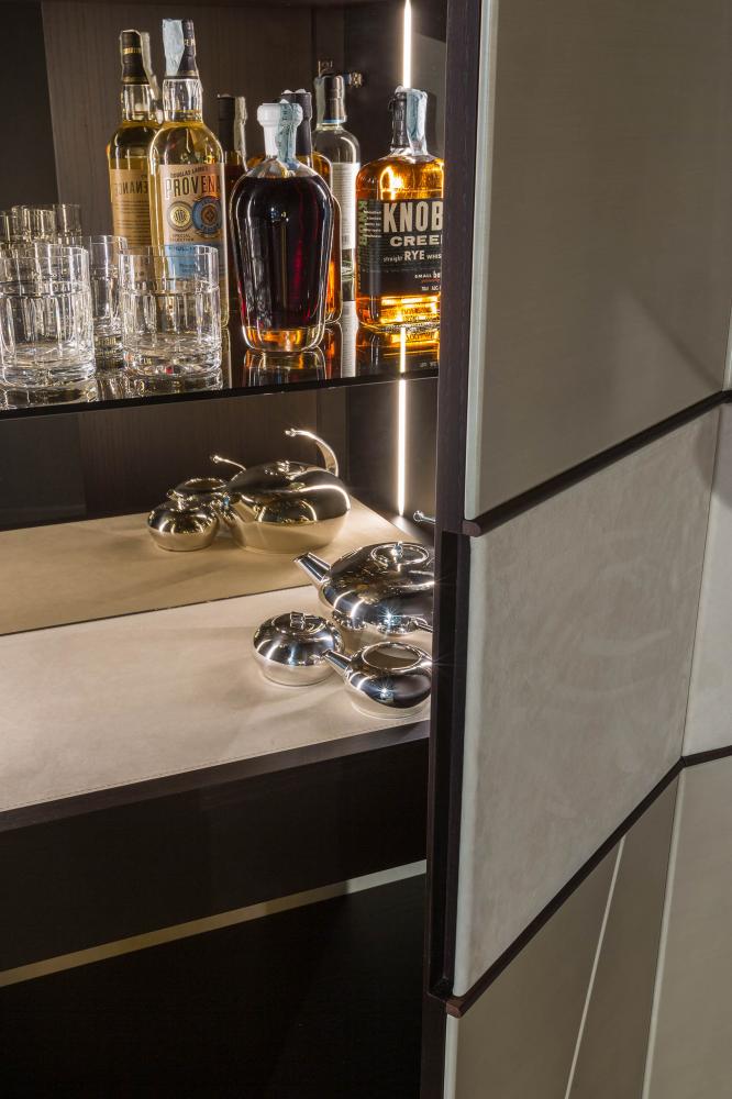 Terre day system perfectly integrates with the doors and panelling of the same collection, creating a play of trapezes, lozenges and rectangles, suitable for containing integrated hidden storage solutions such as wardrobes, drawers, shelves and bar cabinets.