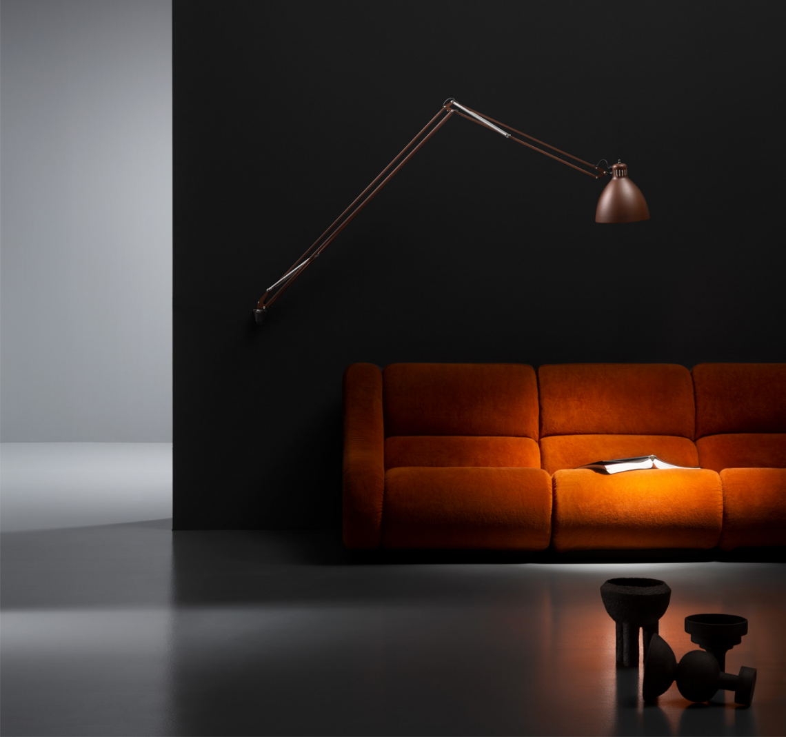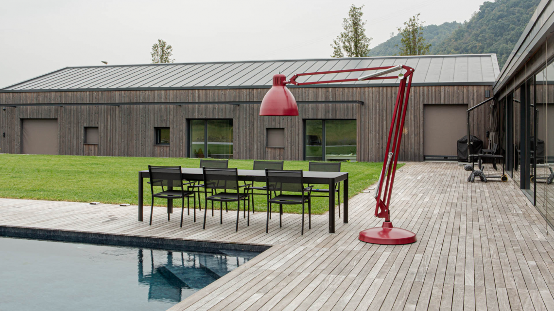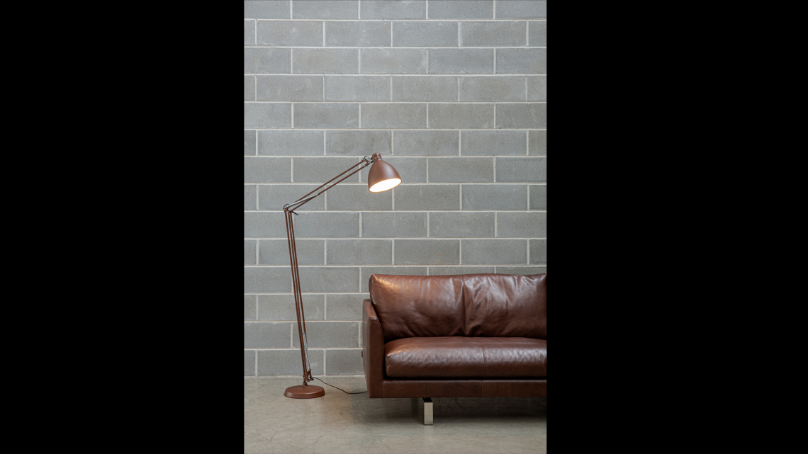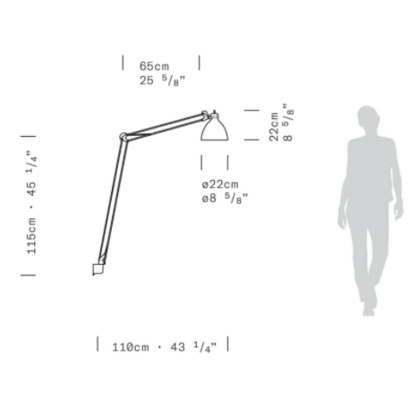 Large scale, matte lacquered, aluminum floor lamp. Available in six colors options with outdoor grade finish for maximum UV protection on both outdoor and indoor versions: white, black, amarant red, mica blue, sablé grey and rust brown with matching steel base. Interior of the diffuser in white lacquer. Custom colors available upon request. Dimmable LED light source (user replaceable). Dimmer on cord (push-dim) or with wireless CASAMBI? Smart Lighting Control.
