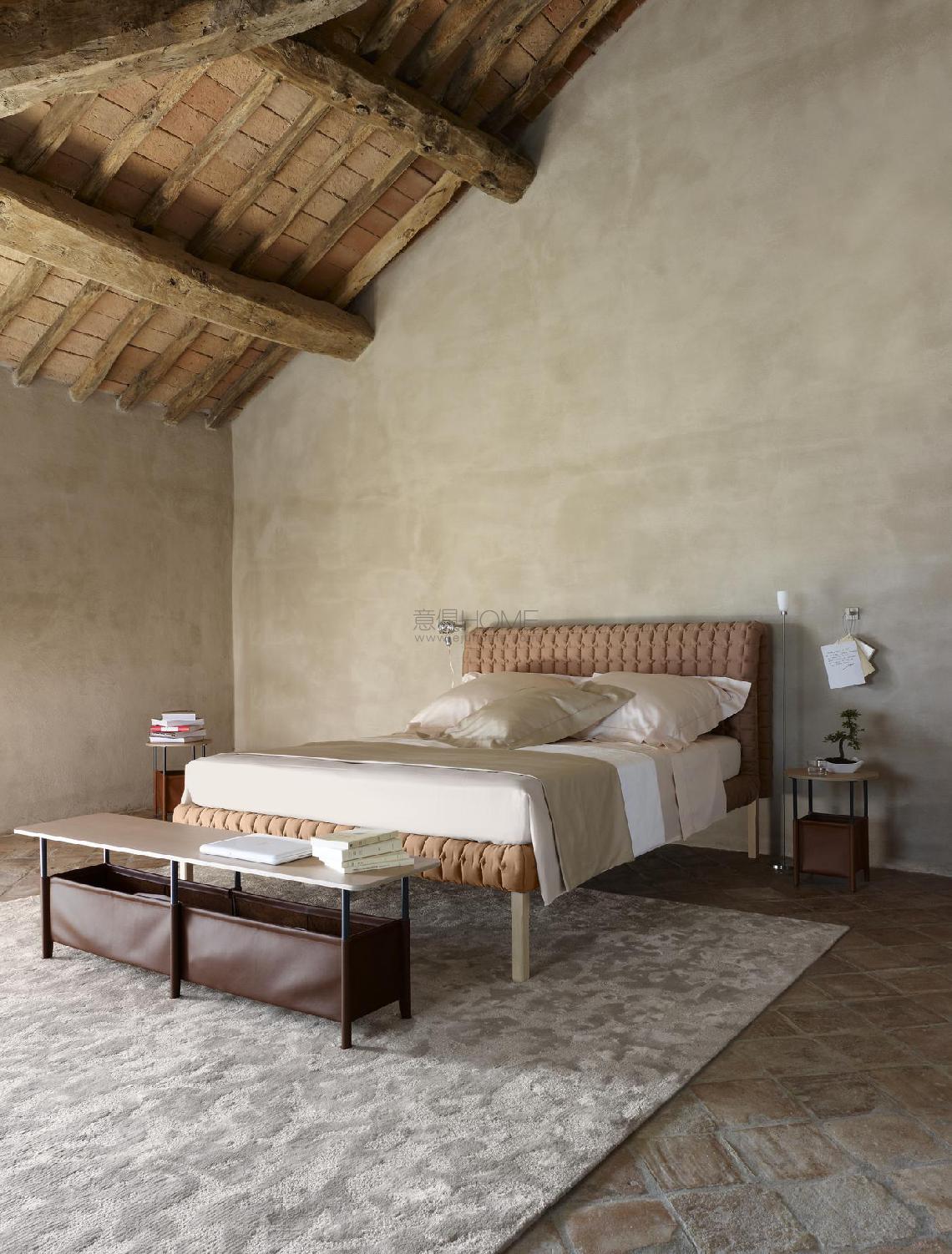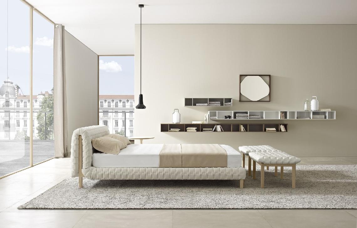 As with the Ruché settee, the Ruché bed is lifted from the ground by a simple, fine structure which supports a comfortable sleep platform. The headboard and frame are dressed with a distinctive quilting, a kind of boutis stitch of padding made using a cross-hatching of interrupted seams. Alternately flattened by the stitches then set free, the fabric 'curls' in places, giving rise both to its unique appearance and to its name, Ruché (a gathered or pleated fabric which serves as decoration on a piece of clothing). For Ligne Roset, Ruché also brings together the unusual and the traditional. The unusual thing about this piece is its solid wood structure, and the great traditional element: the quilting, the very heart of its savoir-faire. Its rangy uprights and the undulations of its duvet combine to produce a harmonious union of rigorous straight lines and soft, welcoming curves.