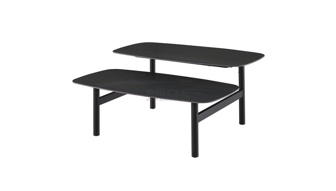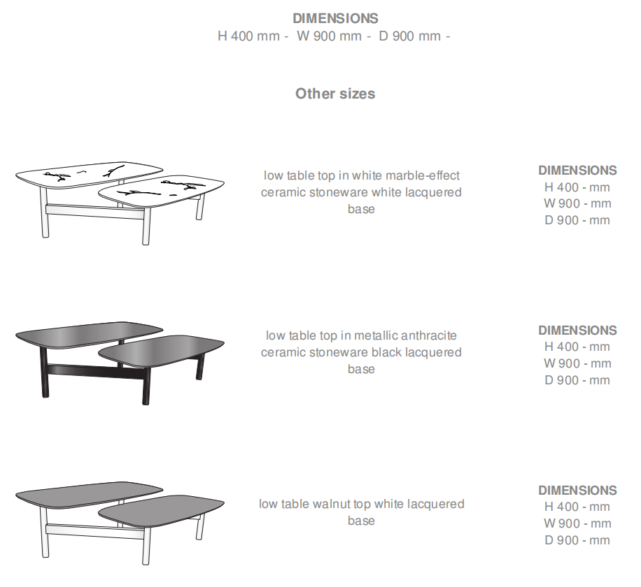 An architectural, minimalist low table comprising 2 tops superposed on a lacquered base. The parallelogram shape concealed beneath the table enables the two tops to be moved easily. The table thus transforms from a classic square shaped to an elongated rectangle. The dimensions indicated are those of the table with its tops in 'square' position. When in its extended, 'rectangular' position, the dimensions are H 40 W 13.8 D 62.7 cm.