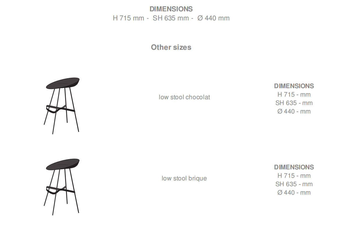 lacquered steel and seat shell in satin-finish moulded polyurethane (colour lacquer : chocolat, brique or argile). Footrest is 20 cm from the floor. The distance between the seatand footrest is 41 cm. Fixed stool with structure in satin black lacquered steel and seat shell in satin-finish moulded polyurethane (colour lacquer : chocolat, brique or argile). Footrest is 31 cm from the floor. The distance between the seatand footrest is 41 cm. Piston stool with seat shell in satin-finish moulded polyurethane (colour lacquer : chocolat, brique or argile). Chromed metal structure and brilliant-chromed footrest. The dimensions and seat height indicated above correspond to the seat in its highest position. In its lowest position the overall height is 63.5 cm and the seat height is 55.5 cm. The distance between the seatand footrest is 40 cm.