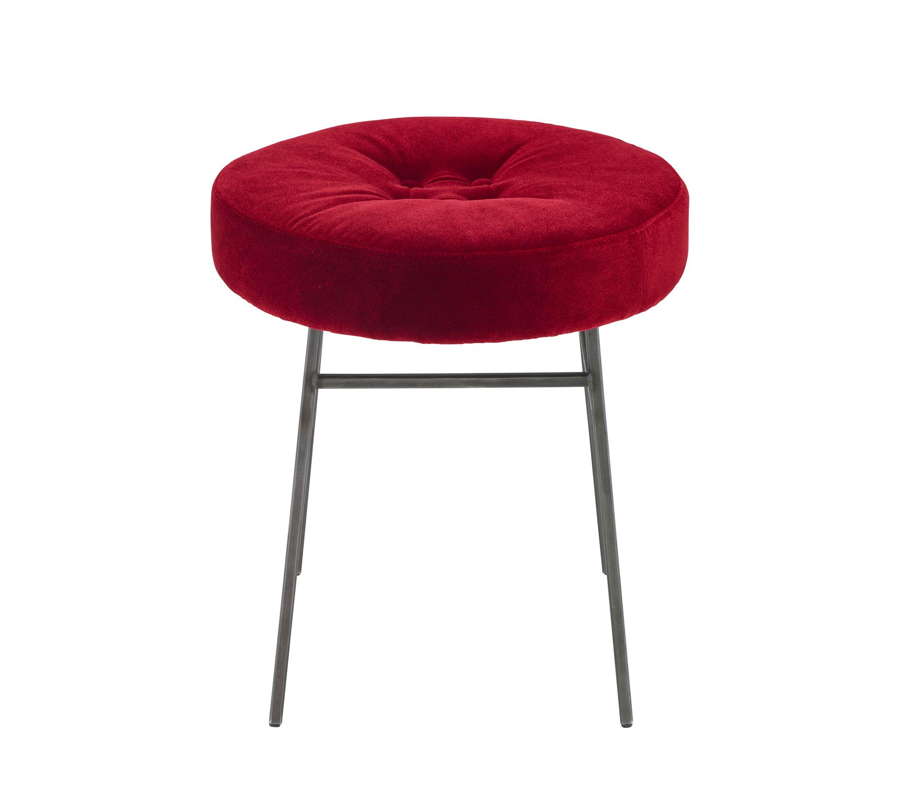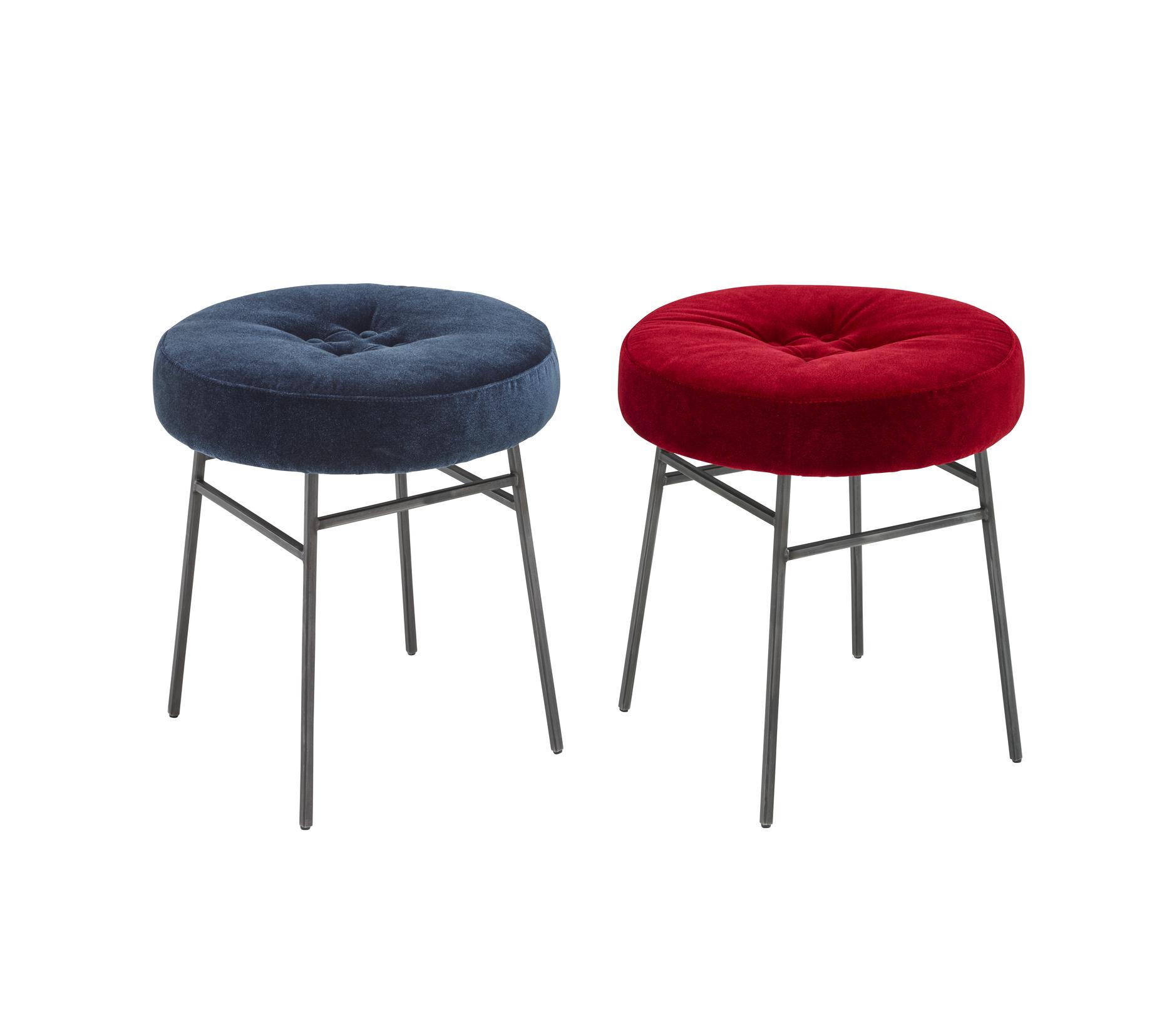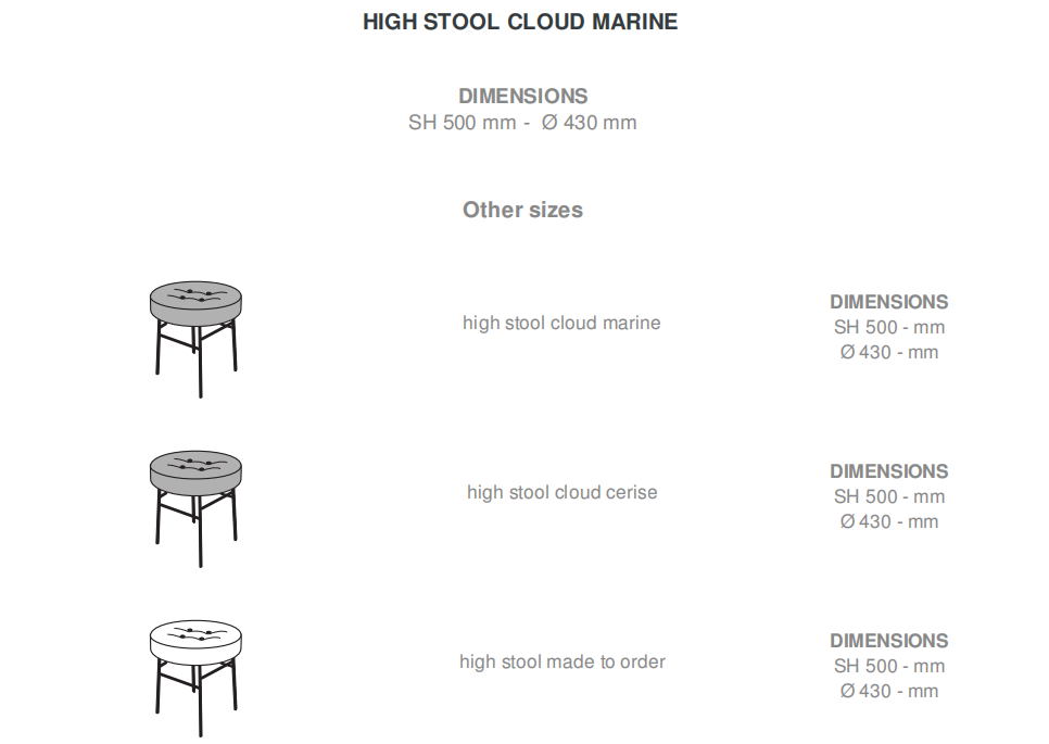 Stool with base in clear varnished forged steel and foam seat (35 kg/m3 - 3,2 kPa) upholstered in Cloud Marine 64 or Cloud Cerise 101 (attractive prices). Also available to order in fabric version.
