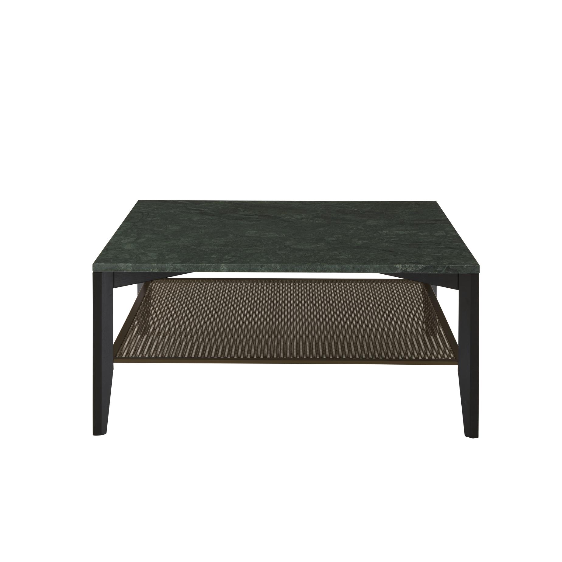 Marie-Aurore Stiker-Metral’s new double-deck low table presents a lower surface in sheet steel delicately perforated with small circles, the bronze lacquer finish of which confers just the right preciosity to contrast with the richness of the upper top in brilliant-polished marble. The two tops, made from cold, glossy materials (steel and marble), are warmed by their colouring (bronze lacquer for the steel and corsé or verde for the marble) and by the structure/base which holds them together, made from matt black- stained solid ash with a visible grain. Two-deck low table. Structure and bevelled base in black-stained solid ash. Lower top in bronze lacquered sheet steel with round perforations and a solid border. Upper top in verde or corsé-coloured marble, brilliant-polished and with stain-resistant treatment, and with honed edges.