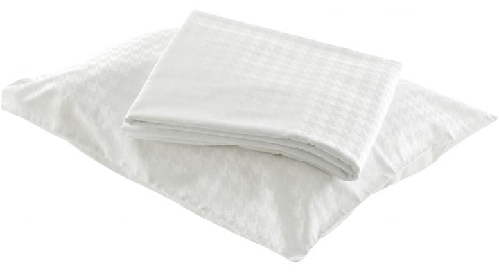 Bedding in white 100 % cotton (130 g/m2). The visible faces of the pillowcases (without flounces( and duvet covers (zip closure) are in 'Pied de coq' fabric; the backs are in white 'Tonalité' fabric (100 % satin cotton - 115 g/m2). The top sheet has a 12 cm hem. Machine washable at 60°. May be bleached using chlorine-based products. Line (drip) dry; do not spin. Medium iron. Dry clean (perchlorethylene).