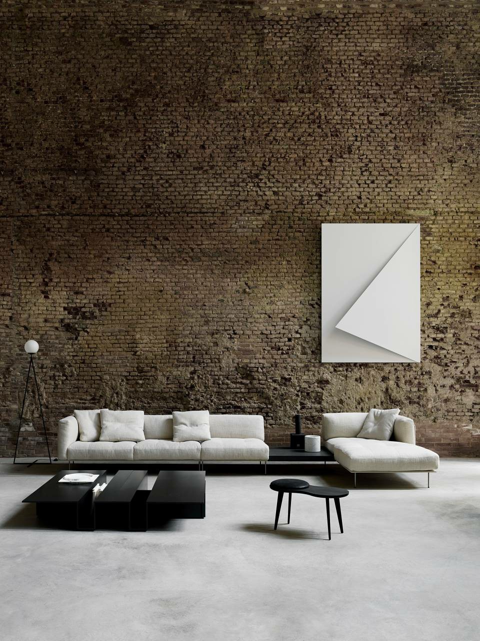 Supporting structure in lacquered drawn tubular steel, seat sprung with coated rubber elastic straps and polyurethane foam. Backrest and armrest structure in self-supporting decorative HPL panel. Covering in 100% polyether, thermally bonded onto a polyamide velveteen backing. Backrest and seat cushions in prewashed and sterilized goose down, with polyurethane foam insert. The seat cushions are quilted with buttons at sight or, on request, quilted without buttons. Armrest cushions in polyurethane foam covered with prewashed and sterilized goose down, with a poplar plywood supporting panel fixed to the frame by plug-in hinges. Stainless steel feet, polished or matt satin-finish, screwed to the base with a bushing. Fabric or leather upholstery, both fully removable by zippers and Velcro fastenings.