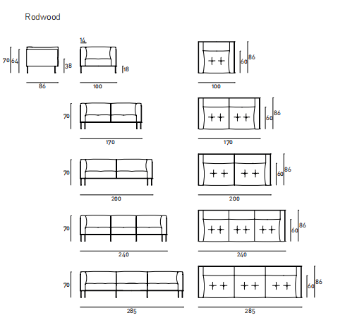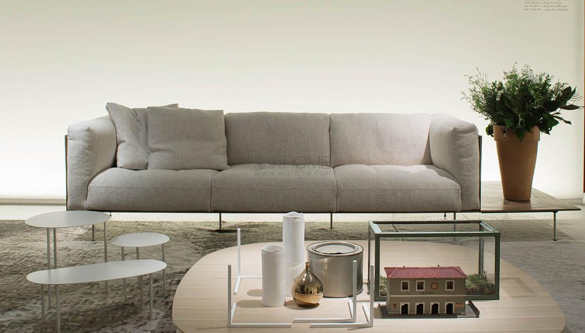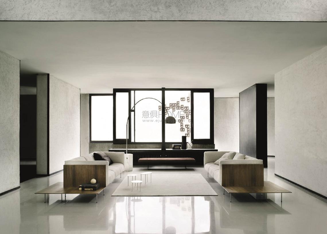 Sofa and armchair. Supporting structure in lacquered drawn tubular steel, seat sprung with coated rubber elastic straps. Backrest and armrest structure in 10mm HPL panel, veneered with heat-treated oak plates with water-based acrylic paint finish. Back and seat cushions in prewashed and sterilized goose down, with polyurethane foam insert. The seat cushions are quilted with buttons at sight or, on request, quilted without buttons. Armrest cushions in polyurethane foam covered with prewashed and sterilized goose down, with a poplar plywood supporting panel fixed to the frame by plug-in hinges. Stainless steel feet, polished or matt-satin finish, screwed to the base with a bushing. Fabric or leather upholstery, both fully removable by zippers and Velcro fastenings. Seat depth 60-80cm.
