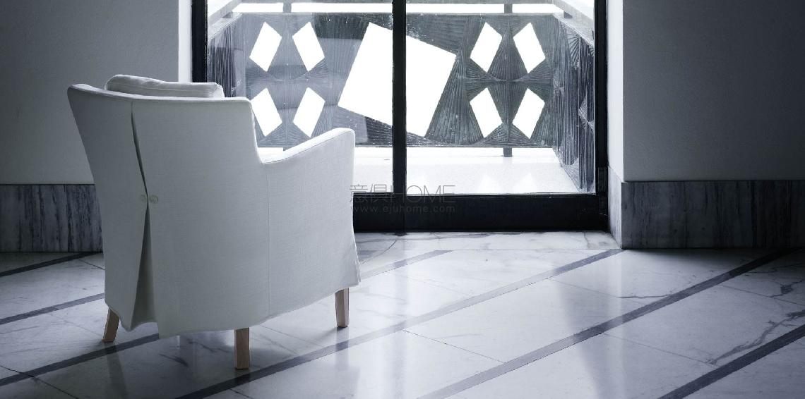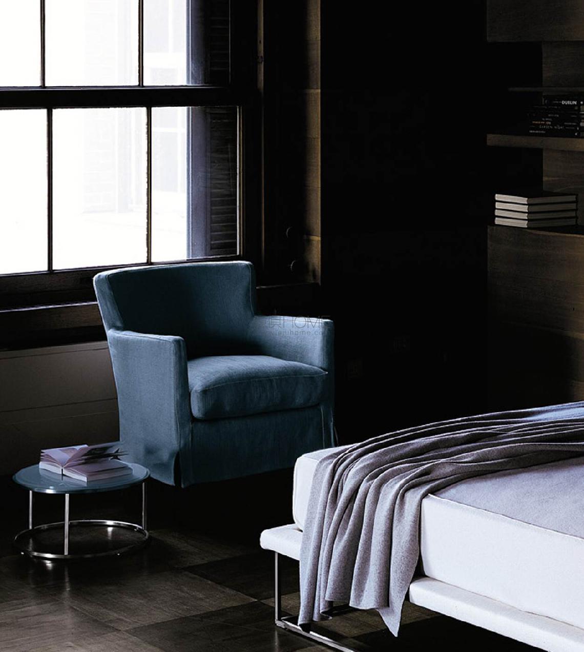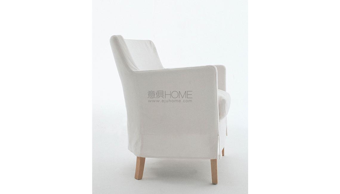 Armchair with one-piece frame in double-panelled beech, poplar and pine. Support in coated rubber elastic straps. Padding in cold-expanded polyurethane foam and differentiated density polyurethane foam. Covering in 100% polyether thermally bonded onto a polyamide velveteen backing. Seat cushion in prewashed and sterilized goose down. Legs in natural beech or, on request, with cherry-wood or walnut finish. Fabric or leather upholstery. The fabric version only is available with flounce 10cm from the floor and is fully removable by zippers and Velcro fastenings. The leather version is always without flounce and non-removable upholstery. Seat depth 50cm.