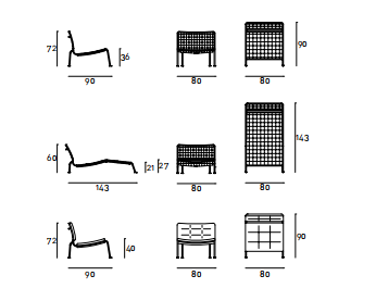 Armchair and chaise longue available for indoor and outdoor. Padded armchair Indoor: supporting frame in steel with chromed-plated finish or epoxy powder coating gunmetal color, burnish color, RAL-K7 9010 white or 9017 black and, on request, AISI 316 stainless steel with matt satin-finish. Metal chassis embedded in coldexpanded polyurethane foam with covering in 100% polyether thermally bonded onto a polyamide velveteen backing. Back and seat cushion with performed polyurethane foam structure, covered with acrylic fibre layers. Quilted fabric or leather upholstery. The fabric version only is fully removable by zippers and Velcro fastenings after unscrewing the chassis from the supporting frame. Outdoor: supporting frame in Stainless Steel AISI 316 with matt satin finish or Stainless Steel 316 with epoxy polyester powder coating gunmetal color, burnish color, RAL-K7 9010 white or RAL-K7 9017 black. Backrest and Seat metal chassis embedded in cold- expanded polyurethane foam covered with “IDROSPALM”, a heat- sealed waterproof fabric protection. Back and seat padding with preformed open-cell structure polyurethane foam DRYFEEL S and fibre for outdoor, coated with heat- sealed waterproof fabric protection. Upholstery, with outdoor fabrics only, always quilted and fully removable by zippers and Velcro fastenings after unscrewing the chassis from the supporting frame. Woven armchair and chaise longue. Indoor: supporting frame in AISI 316 stainless steel with matt satin-finish, steel with chromed-plated finish or epoxy powder coating gunmetal color, burnish color, RAL-K7 9010 white and RAL –K7 9017 black. Woven with hide, hempen rope, leather Scooby (braided leather trim), PVC profile or in cellulose cord in the colours available in the collection. Supporting cushions in polyurethane foam covered with acrylic fibre layers and fabric or leather upholstery. Outdoor: supporting frame in AISI 316 stainless steel with matt satin-finish or epoxy powder coating gunmetal color, burnish color, RAL-K7 9010 white and RAL-K7 9017 black. Woven with PVC profile, in the colours available in the collection. Supporting cushions in open-cell structure polyurethane foam for outdoor, coated with fiber for outdoor. Upholstery with outdoor fabrics only. Cushions’ upholstery, in both versions, fully removable by zippers. Seat depth 51-60cm. The supporting frame of armchair Frog in stainless Steel AISI 316, has undergone and passed the corrosion test (UNI ISO 9227:93) with issue of relative certificate by CATAS?.