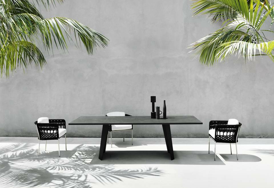 Armchair available for indoor and outdoor. Indoor version: tubular steel frame with chromed finish, or with epoxy powder coating gunmetal color or in AISI 316 Stainless Steel with matt satin- finish. Seat panel in tubular steel with epoxy powder coating, padded in polyurethane foam (for chrome and lacquered versions) or in self- supporting decorative HPL plastic laminate (for AISI 316 stainless steel version). Seat cushion in differentiated density polyurethane foam, covered with acrylic fibre layers. Backrest cushion in preformed polyurethane foam covered with acrylic fibre layers. Fabric or leather upholstery, both fully removable by zippers, after unscrewing the seat panel from the frame (for chrome and lacquered version). Outdoor version: tubular steel frame in AISI 316 stainless steel with matt satin- finish. Seat panel in self- supporting decorative HPL plastic laminate. Seat and backrest cushions padded with open-cell structure polyurethane foam and covered with fibre for outdoor. Upholstery with outdoor fabrics only, fully removable by zippers. Both version woven with a hypoallergenic, recyclable, eco-friendly tubular, suitable both.