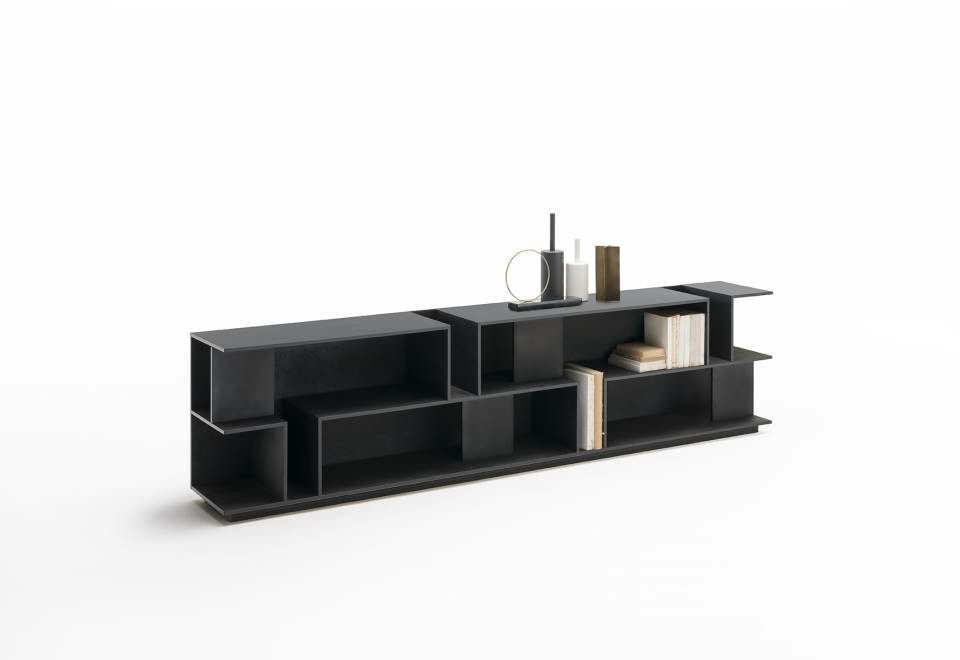 Storage unit, available in two versions: Floor-standing unit: supporting frame, 12 mm thick, made in folding, in “sandwich” of MDF and aluminum sheet pressed and glued together and MDF plinth, matt black lacquered with integrated black adjustable PVC tips. Wall-mounted unit: supporting frame, 12 mm thick, made in folding, in “sandwich” of MDF and aluminum sheet pressed and glued together, with a steel bar embedded in the back side, fitted with threaded holes which allow to install it on the wall through an MDF frame, matt black lacquered, with integrated hook and inclination-control system (height, depth and inclination). Wall-mounted version maximum load: . 240cm Cabinet/Unit: 90Kg . 120cm Cabinet/Unit: 40Kg