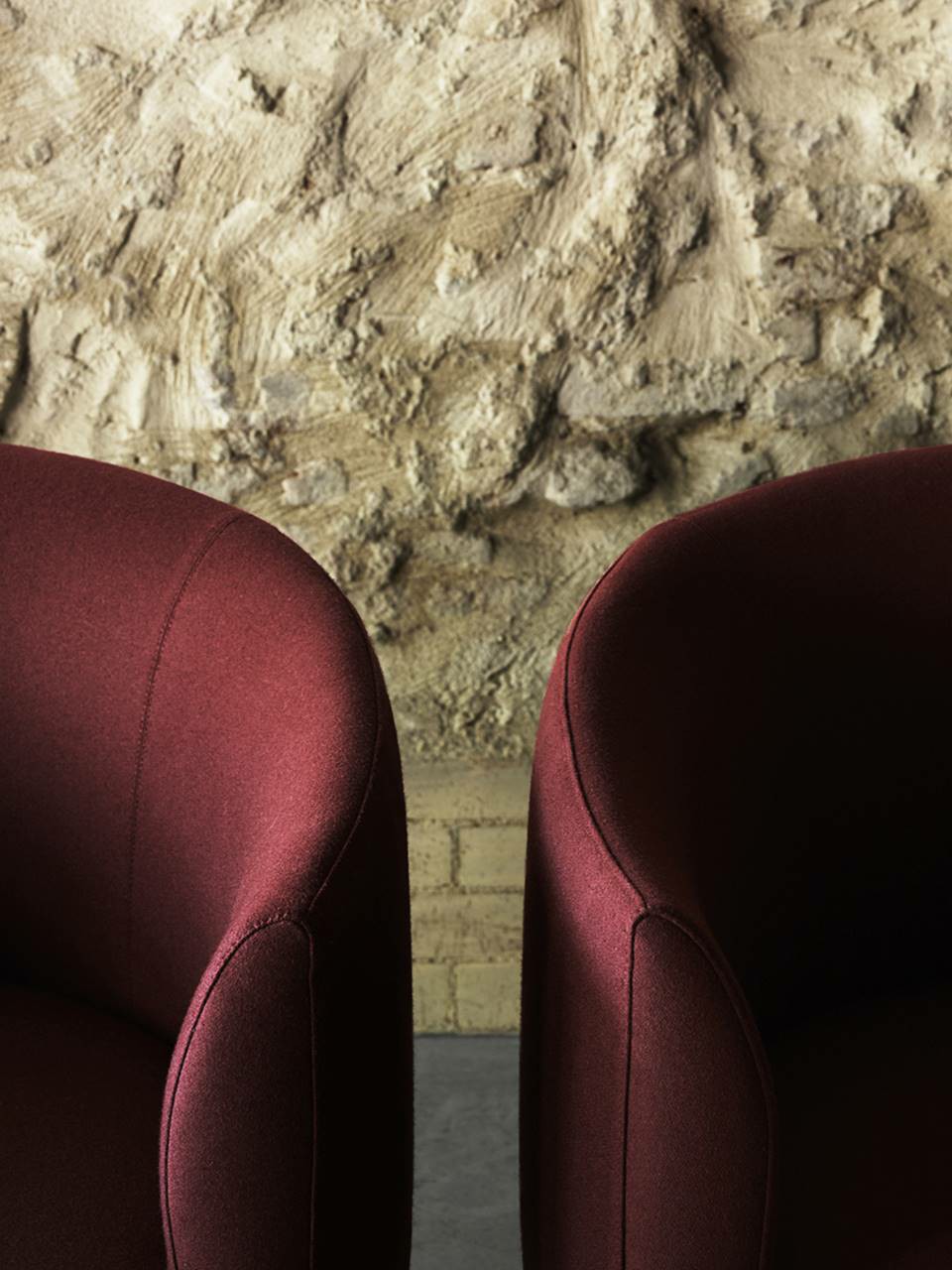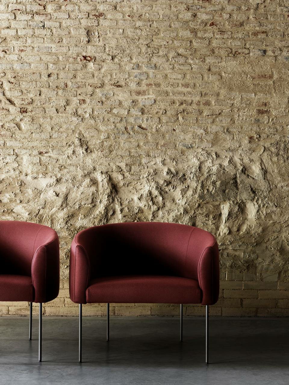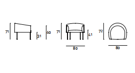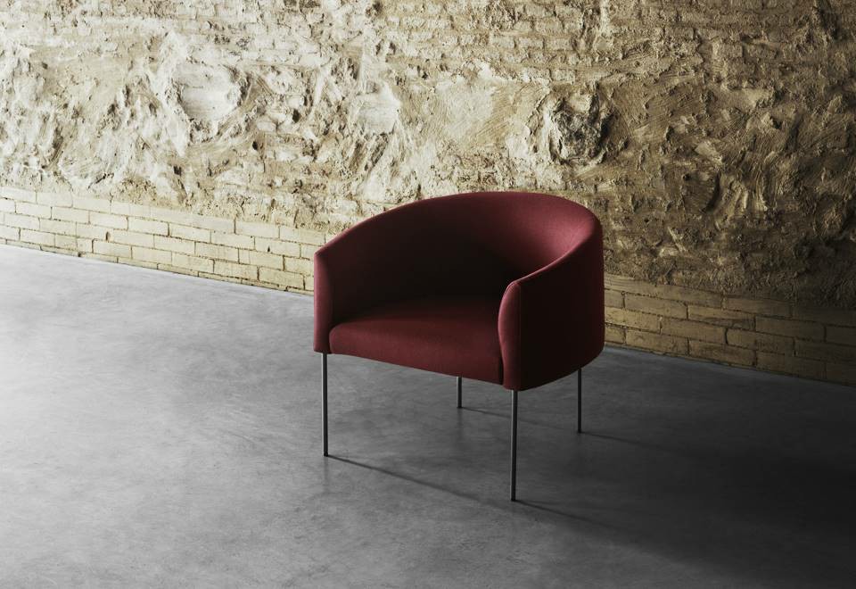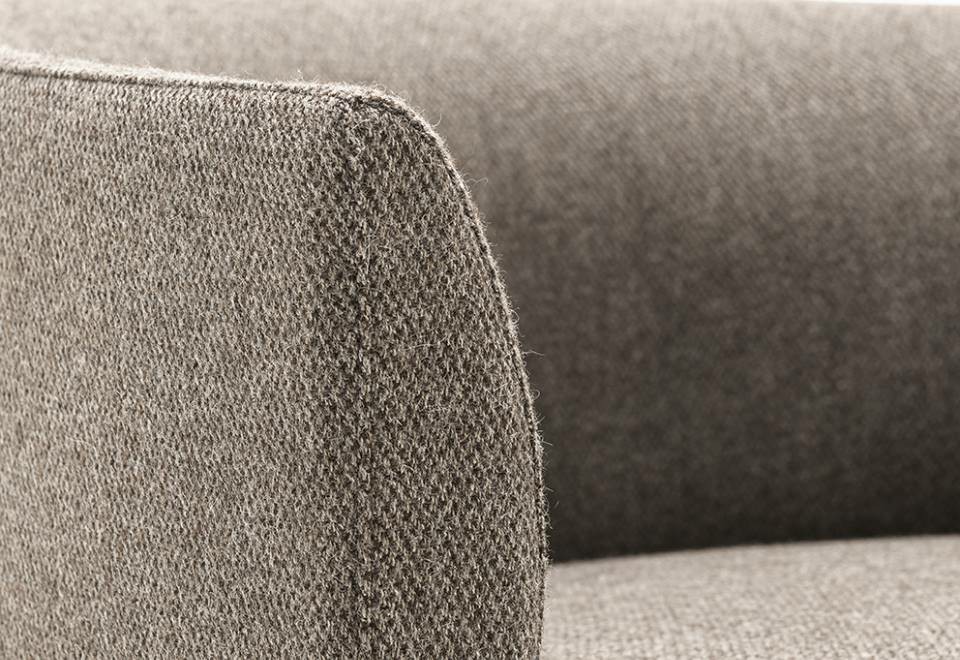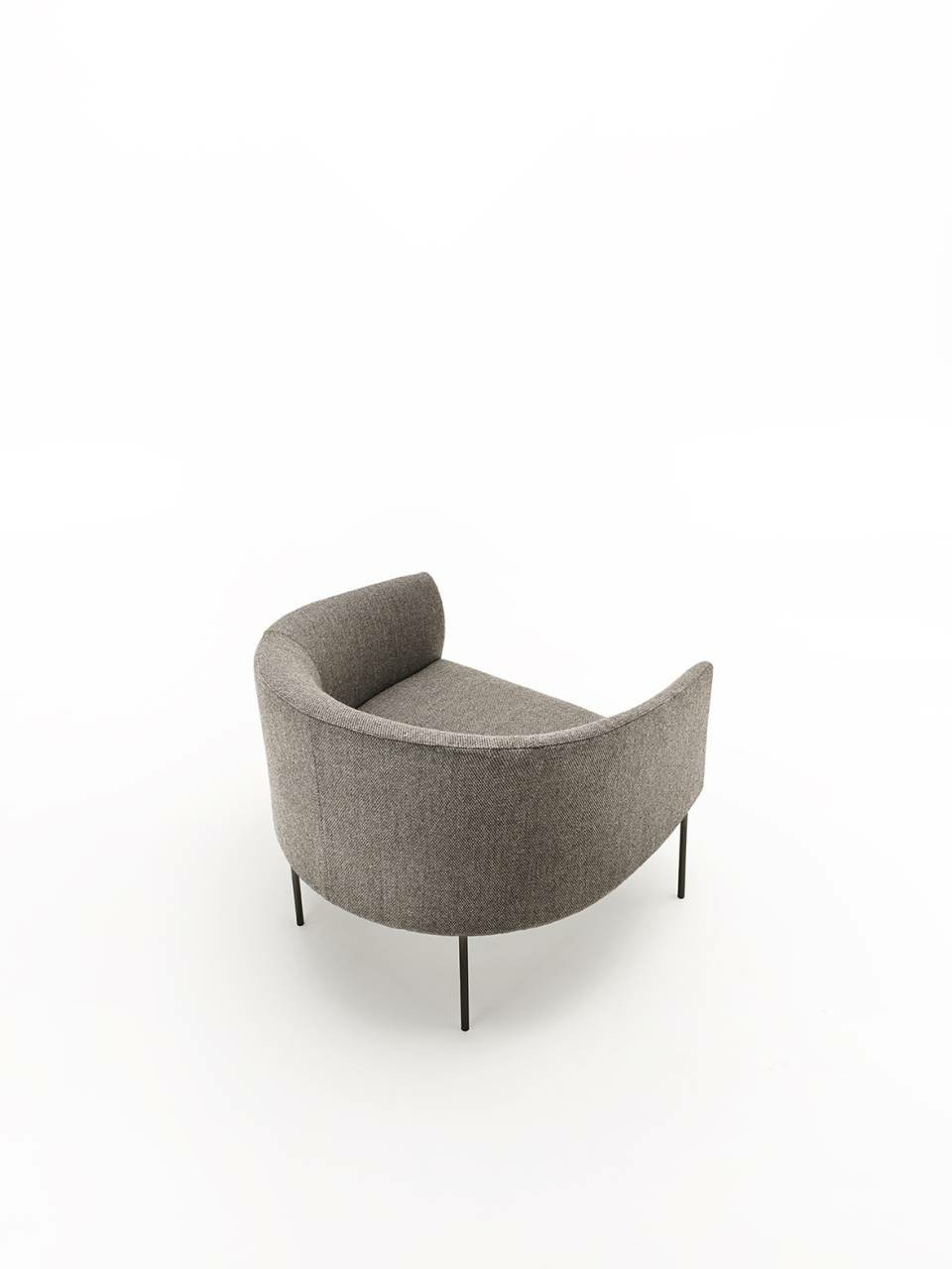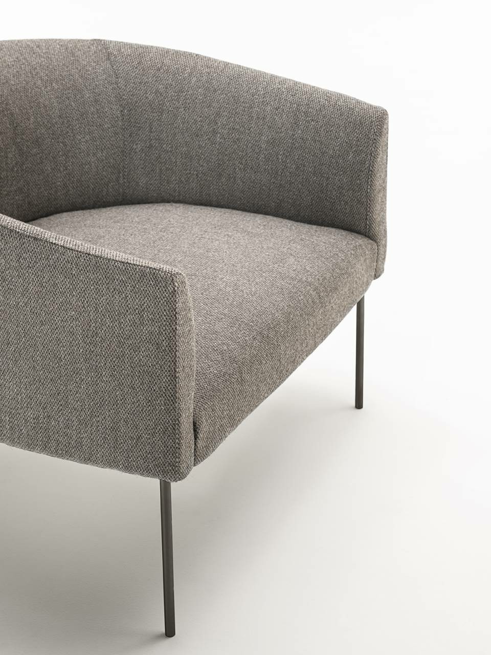 Armchair with backrest frame with steel insert embedded in cold-expanded polyurethane foam; seat frame in tubular steel, section 30x30mm, sprung with coated rubber elastic straps embedded in cold-expanded polyurethane foam, secured to the backrest frame through steel plates. Covering in 100% polyether thermally bonded onto a polyamide velveteen backing and needle punched, resinated, nonwoven polyester fibre, bonded onto a polyamide velveteen backing. Steel feet ?15mm lacquered with epoxy powder coating gunmetal grey colour, screwed to the backrest frame with a bushing and adjustable black PVC tips. Fabric or leather upholstery. The fabric version only is fully removable by zippers and Velcro fastenings.
