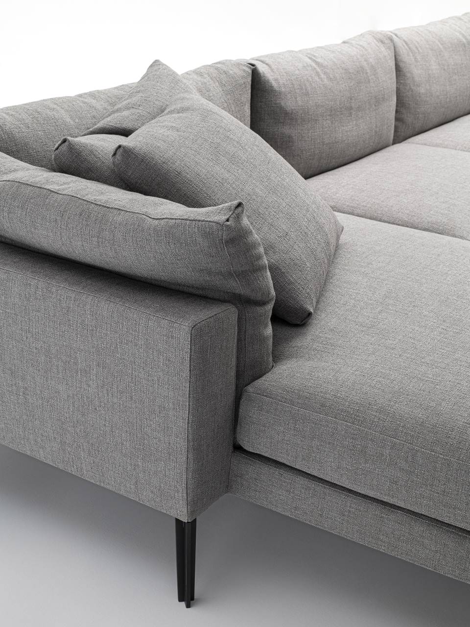 Modular sofa with backrest and armrests structure in multilayer poplar wood and double-panelled fir-wood, padded in differentiated density polyurethane foam, and covering in needle punched, resinated, non-woven polyester fiber, bonded onto a polyamide velveeten backing. Steel seat chassis, with epoxy powder coating, sprung with coated rubber elastic straps, padded in polyurethane foam. Backrest and armrest cushion in prewashed and sterilized goose down, stitched into separate compartments, with polyurethane foam insert. Seat cushion in differentiated density polyurethane foam and Visco-soft insert, covered with acrylic fibre layers. Foot made of laser-cut steel sheet with epoxy powder coating gunmetal grey color. Floor support secured by black PVC feet. Fabric or leather upholstery, both fully removable by zippers and Velcro fastenings. Seat depth: 68 – 134cm.