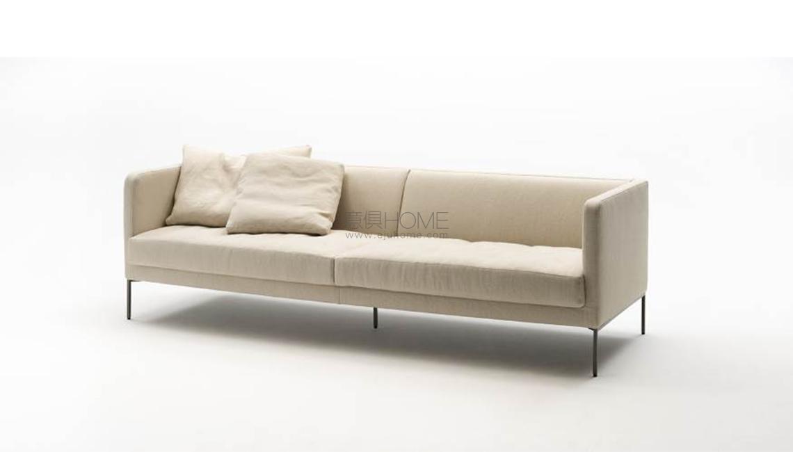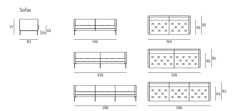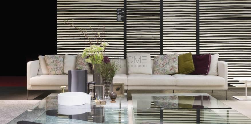 Armchair, fix or modular sofa with backrest and armrest frame in double-paneled fir-wood and padding in polyurethane foam and acrylic layers; seat chassis, in 40 x30 mm tubular steel with black epoxy powder coating and sprung with elastic straps, inset in the base structure in multilayer poplar wood padded in polyurethane foam covered in 100% polyether thermally bonded onto a polyamide velveteen backing. Backrest cushions, fixed to the structure through the coverings, in polyurethane foam and acrylic fibre layers. Quilted seat cushions, in prewashed and sterilized goose down, stitched into separate compartments, with differentiated density polyurethane foam insert. Tublar steel feet, joined by a bracket, in square section 15x15mm with bronzed epoxy powder coating and adjustable black PVC tips. Fabric or leather upholstery, with sewn stitching on seat cushion only, both fully removable by zippers and Velcro fastenings. Seat depth: armchair 53 cm; Easy Lipp 65cm; Easy Lipp XL 85 cm.
