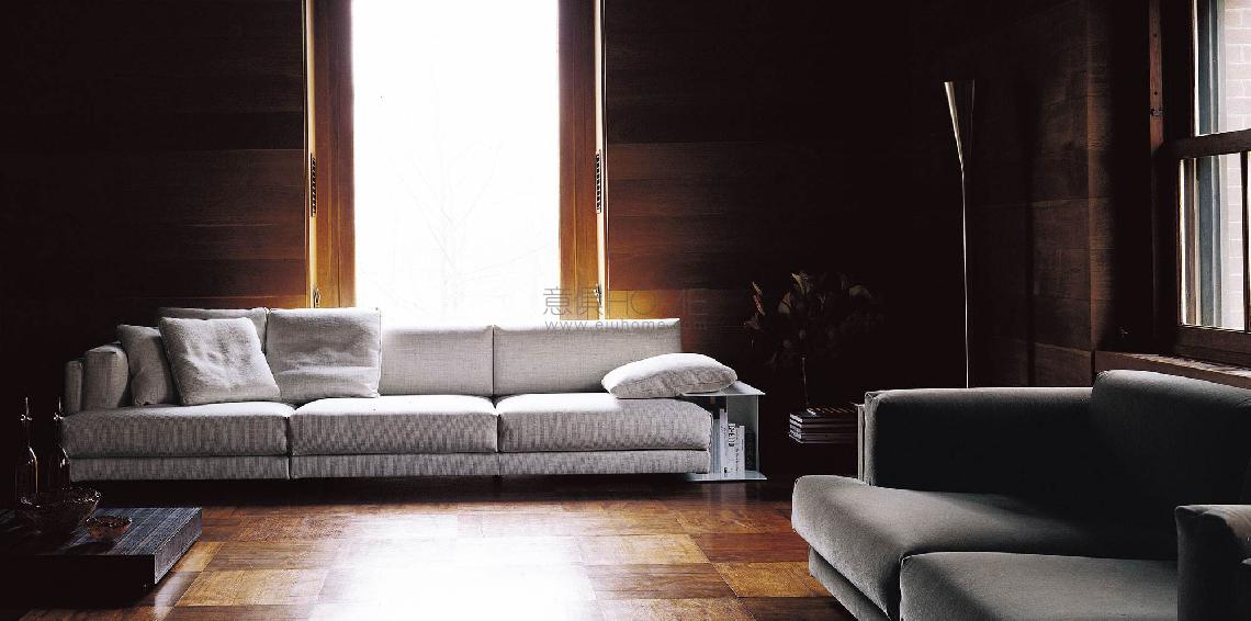 Fix or modular sofa with one-piece frame in double-paneled poplar and pine. Steel seat chassis with support in cross-woven, coated rubber elastic straps. Shell padding in differentiated density polyurethane foam. Covering in needle punched, resinated, non-woven polyester fibre, bonded onto a polyamide velveteen backing. Seat cushions in differentiated density polyurethane foam, coated with acrylic fibre layers. Back and armrest cushions in differentiated density polyurethane foam, coated with acrylic fibre layers, or on request, in prewashed and sterilized goose down, stitched into separate compartments, with preformed polyurethane foam insert. Anodized aluminum black feet, adjustable on three levels, from 7 to 10cm. Fabric or leather upholstery. The fabric version only is fully removable by zippers and Velcro fastenings. The leather version is always with non-removable upholstery. Seat depth 83cm.