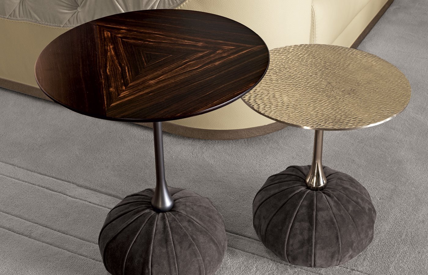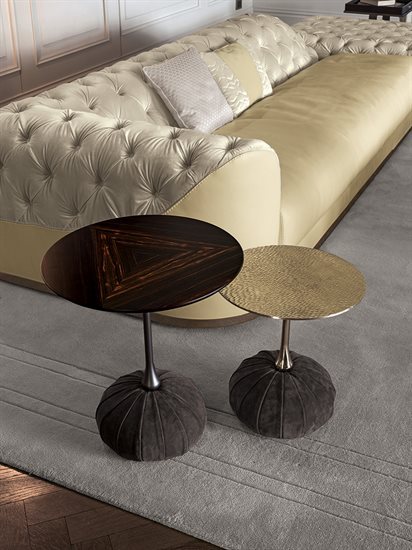 一系列展現(xiàn)講究簡約特色的圓桌,采用的精選材料使所有品項(xiàng)皆散發(fā)精致且樸實(shí)優(yōu)雅的氣質(zhì)。具備單柱金屬車削結(jié)構(gòu),圓球形底座外覆釘扣裝飾或放射打褶造型的皮料。大理石、黃銅或木材桌面,猶如漂浮在空間中。