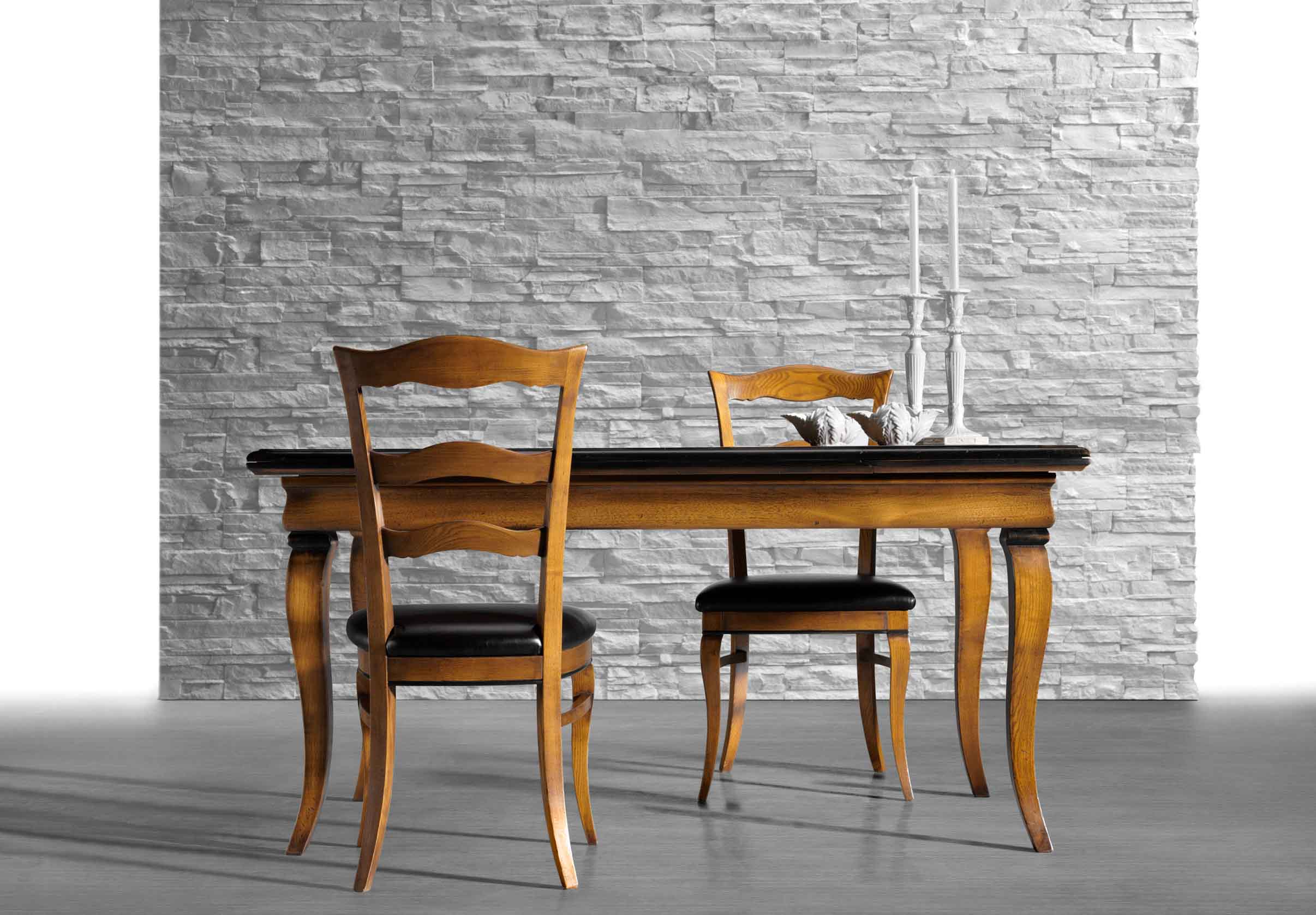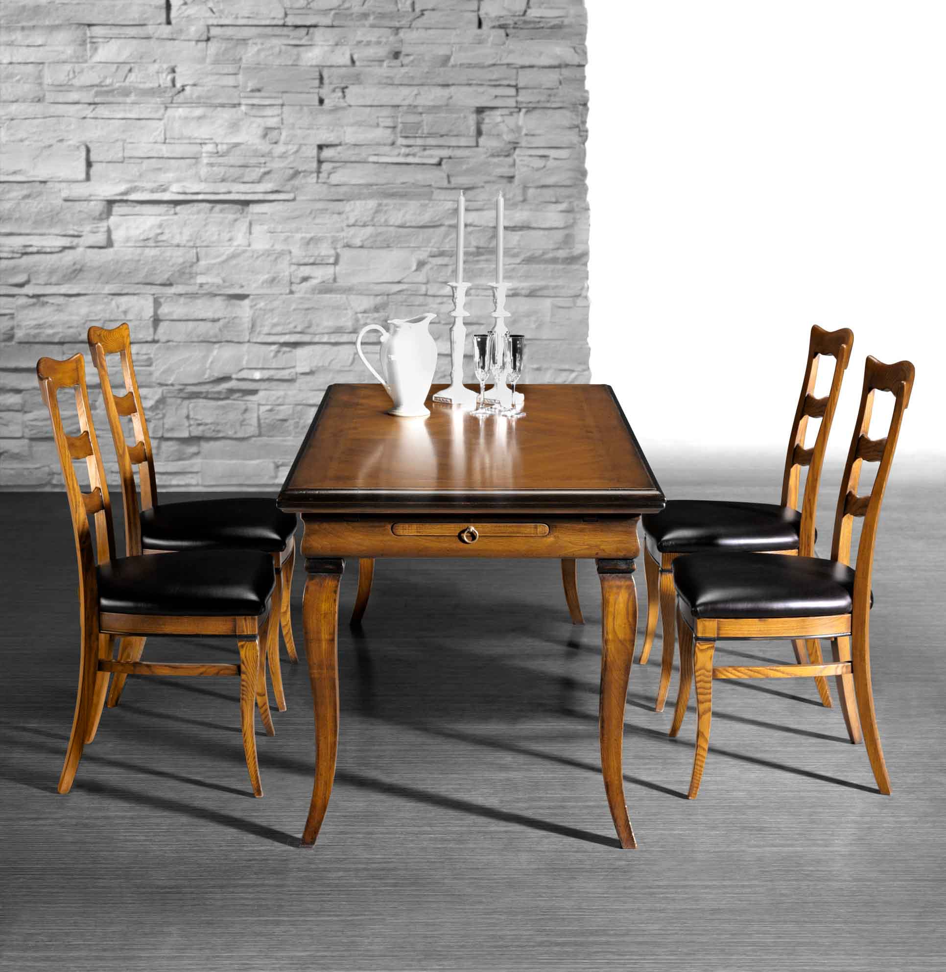 The solid wood in a natural finish combined with the traditional contours of the Antiqua table evoke country suggestions tied to nature and its colours. The Clementina chairs completely in wood or with upholstered padded seat, are perfect for pairing with this table to accentuate its personality.