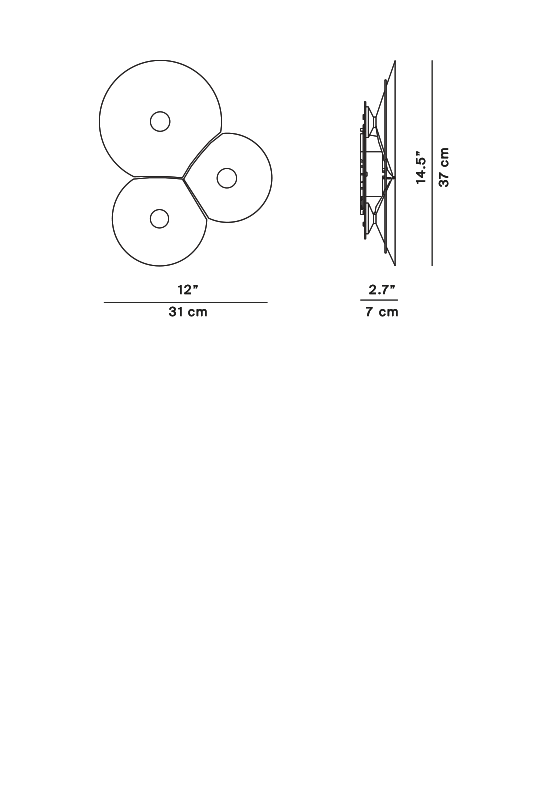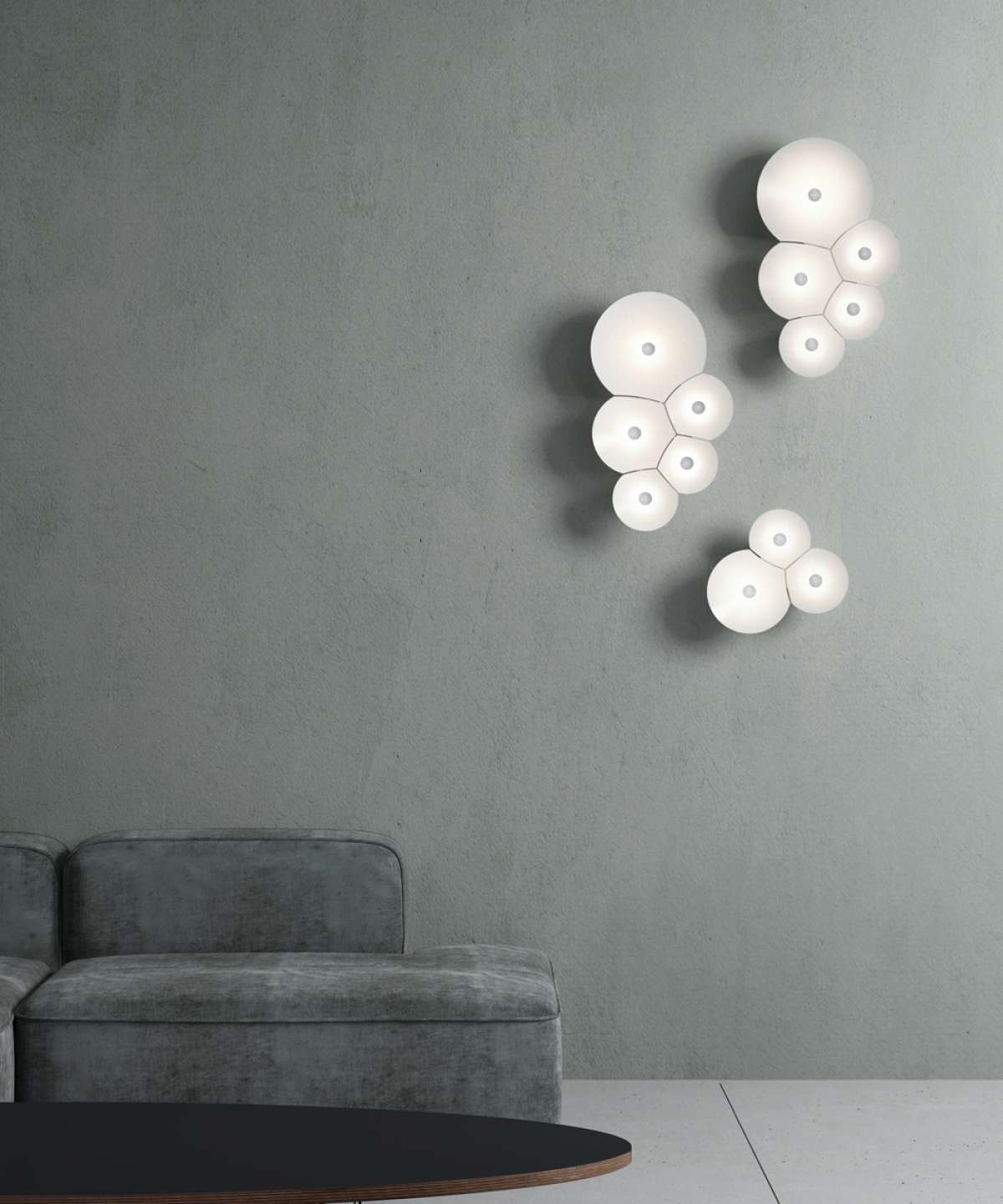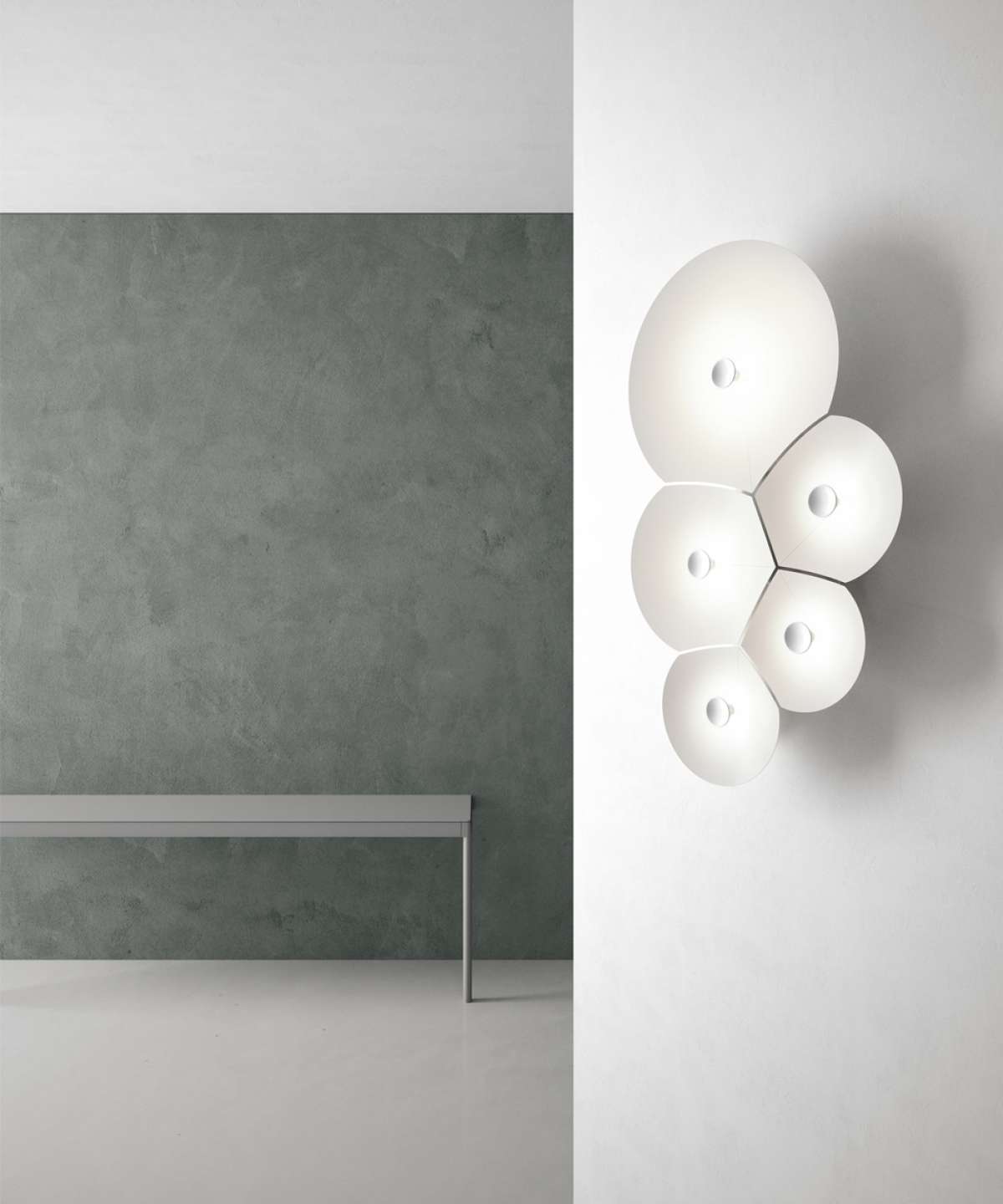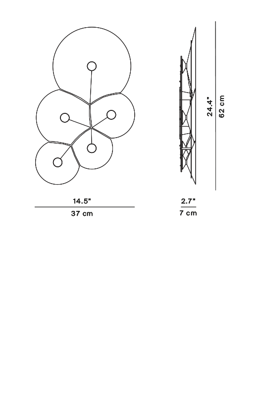 A series of parabola of different sizes intersect to generate the characteristic geometric form of soap bubbles; conical, broad and flat shapes, each composed of a silhouette in white polycarbonate, slightly bent to take on a structural nature. Each bubble has a light source at its center: it contains the core of the lamp, and thanks to built-in dimmable LEDs spreads appealing, soft light that is reflected towards the inside of the cone.