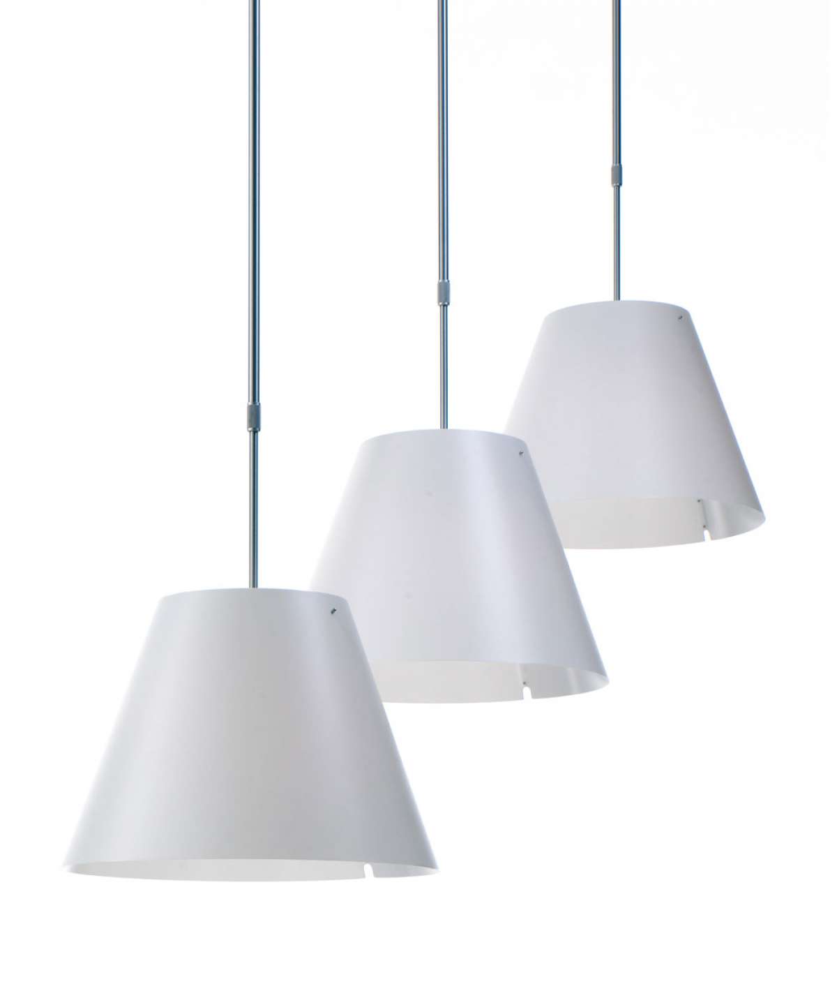 Elegant and light, this lamp emits a pleasant warm light through a silk-screened polycarbonate shade. The lamp’s height may be adjusted by means of a characteristic steel counterweight.