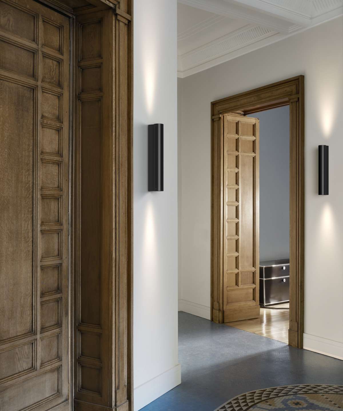 Wall fixtures for indoor use. The cylindrical body connects smoothly to architectural surfaces. The optics permit a wide range of lighting solutions for multiple contexts.