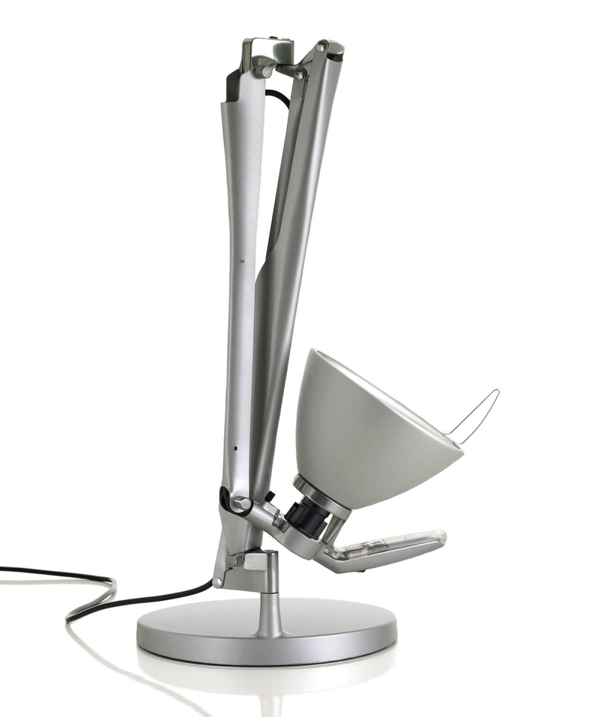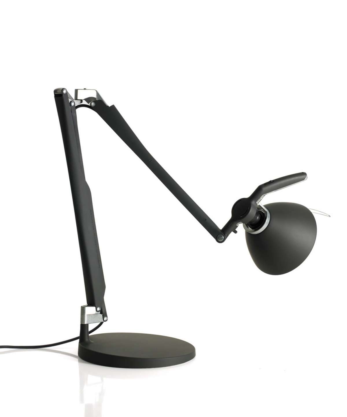 Fortebraccio sets new standards of efficiency and practicality for desk lamps. The central joint allows the two arms to rotate independently on the horizontal and vertical axes, guaranteeing great fluidity of movement even in extreme and unusual positions. The polycarbonate grip enables users to maneuver the lamp simply and manageably.