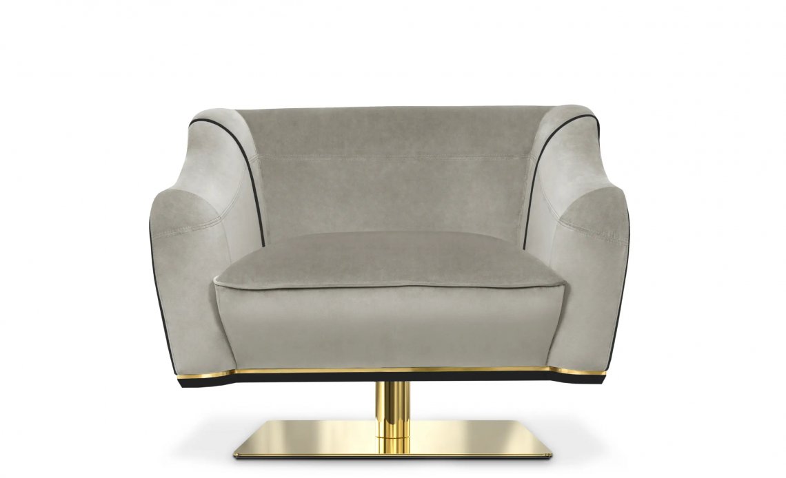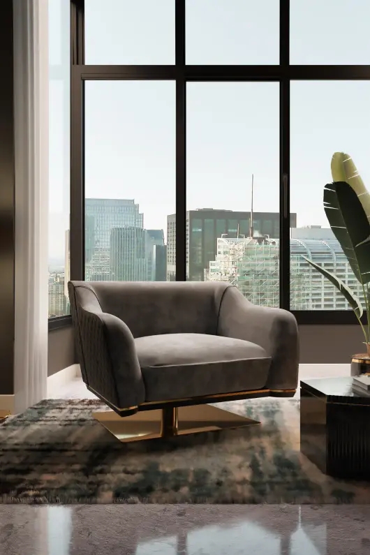 Inspired by the 1940s movie scene, this design is a lighter take on its family’s darker design. Crafted with the highest quality materials such as leather and velvet, this luxurious swivel single sofa provides the utmost comfort and accessibility with its rotating feature and will perfectly adapt to different ambiances and styles, becoming a focal feature in any space.