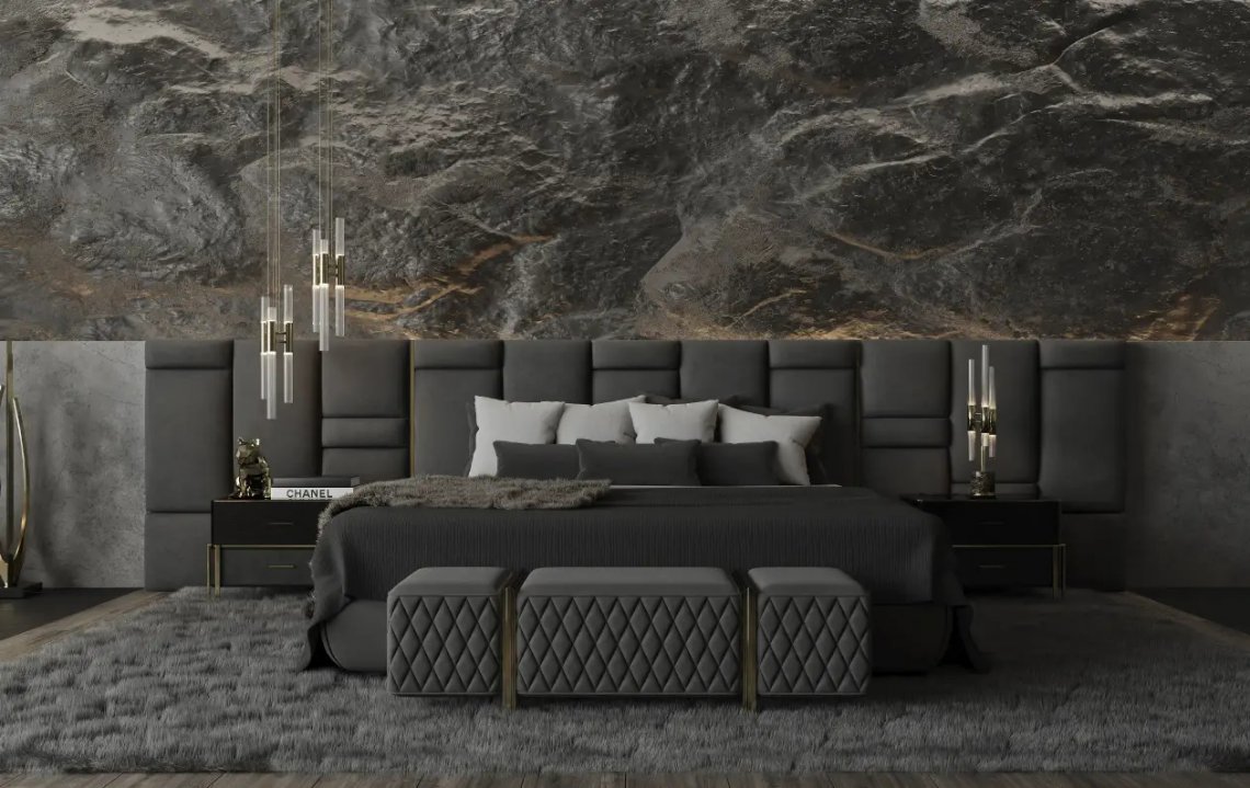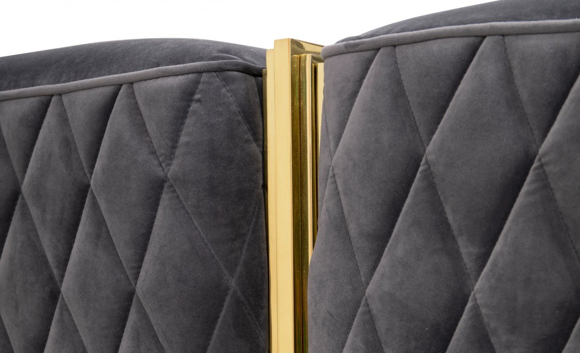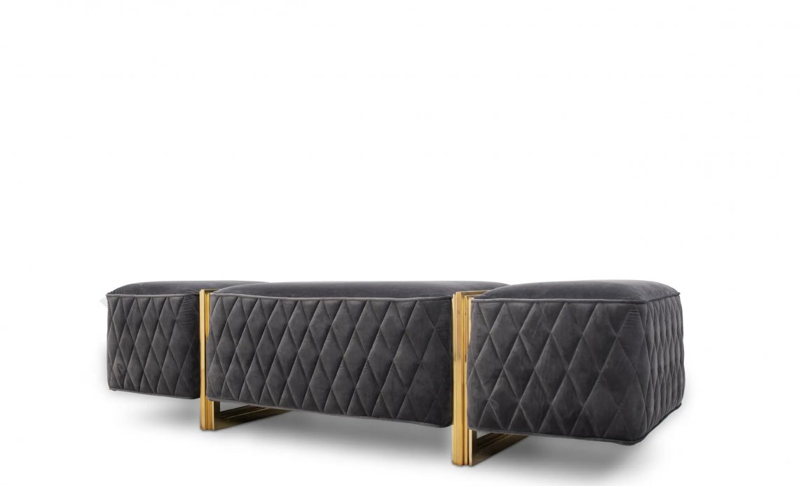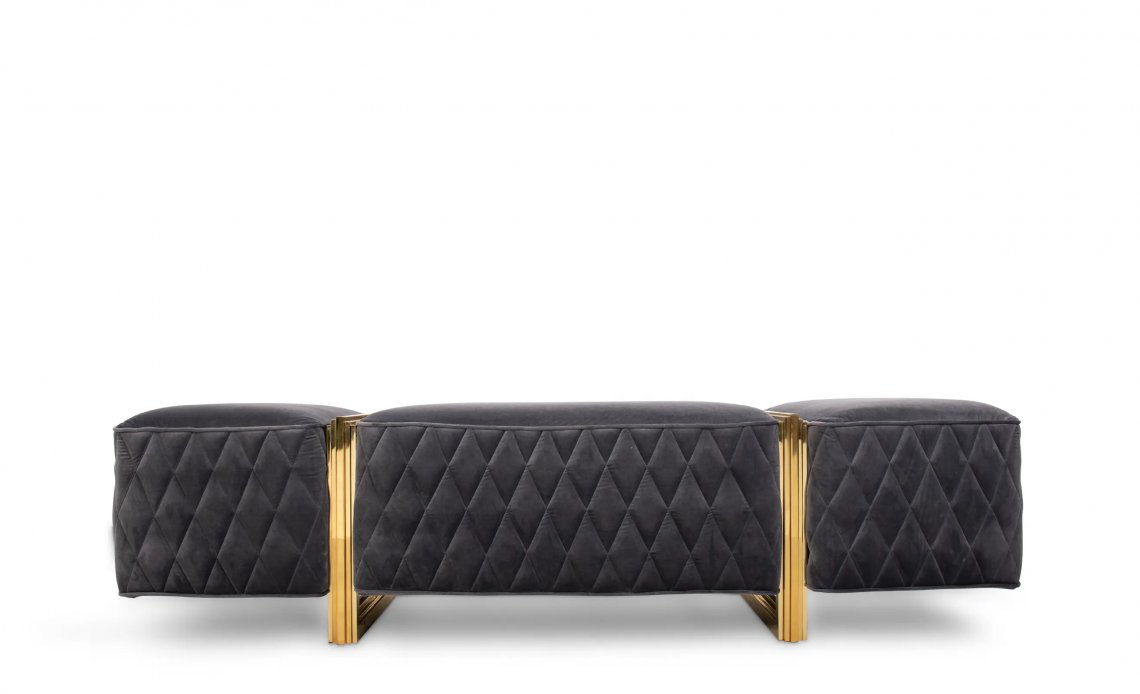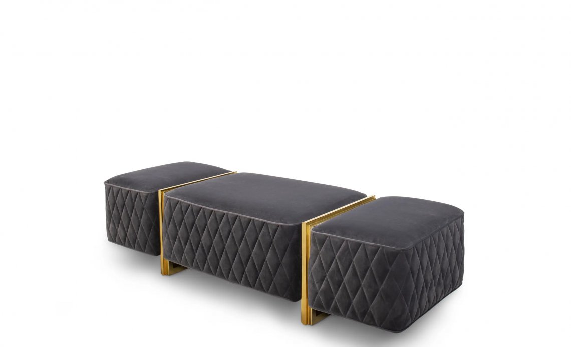 A highly stylish ottoman with a smooth and elegant shape. Made with grey velvet and with polished brass legs, this upholstered beauty will bring an attractive presence to any room, hotel suite, or master bedroom.