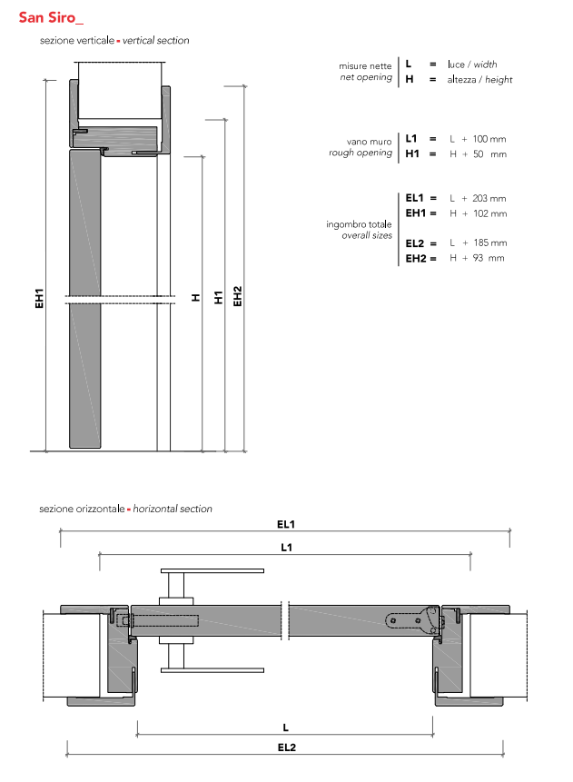 Swing wood door 41 mm thick. Magnetic lockset, concealed hinges and anti-noise gasket included. Woos jamb. Trim 12 mm thick, flush with the door on the pull side. Telescopic woos trim for wall thickness from 105 to 130 mm; available for max wall thickness 500 mm. Reversible opening direction. Concealed hinges. Mounted on traditional wooden subframe.