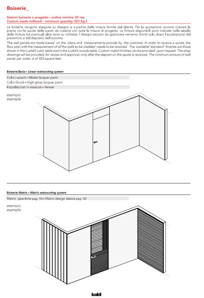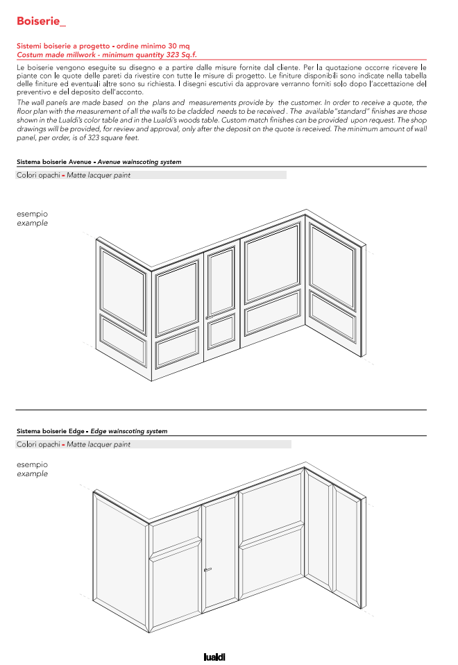 Avenue boiserie is made using shaped panels, one side only. Finishes: matte lacquer paint. Dimensions: width from 600 mm up to 1200 mm; height max 3000 mm.