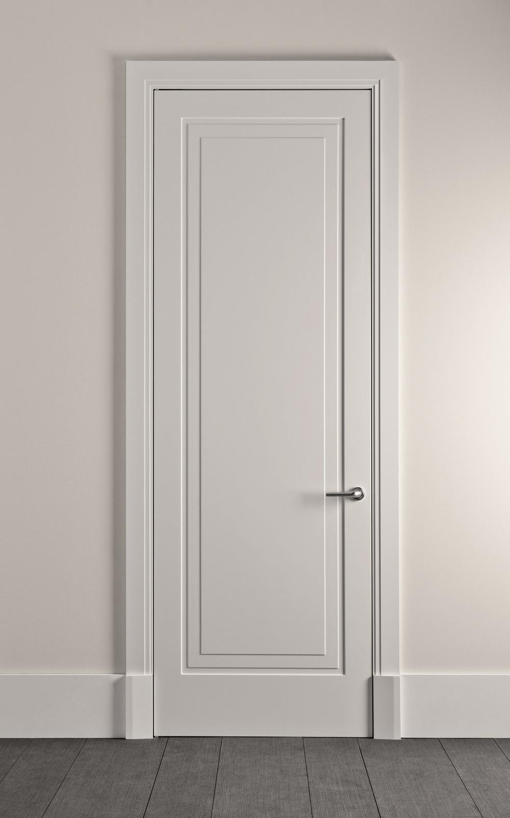 Swing wood door 41 mm thick with one, two or three recessed panels. Magnetic lockset, concealed hinges and anti-noise gasket included. Wood jamb. Trim 15 mm thickness, flush with the door on the pull side. Telescopic wood trim for wall thickness from 110 to 135 mm. Available for max wall thickness 500 mm.