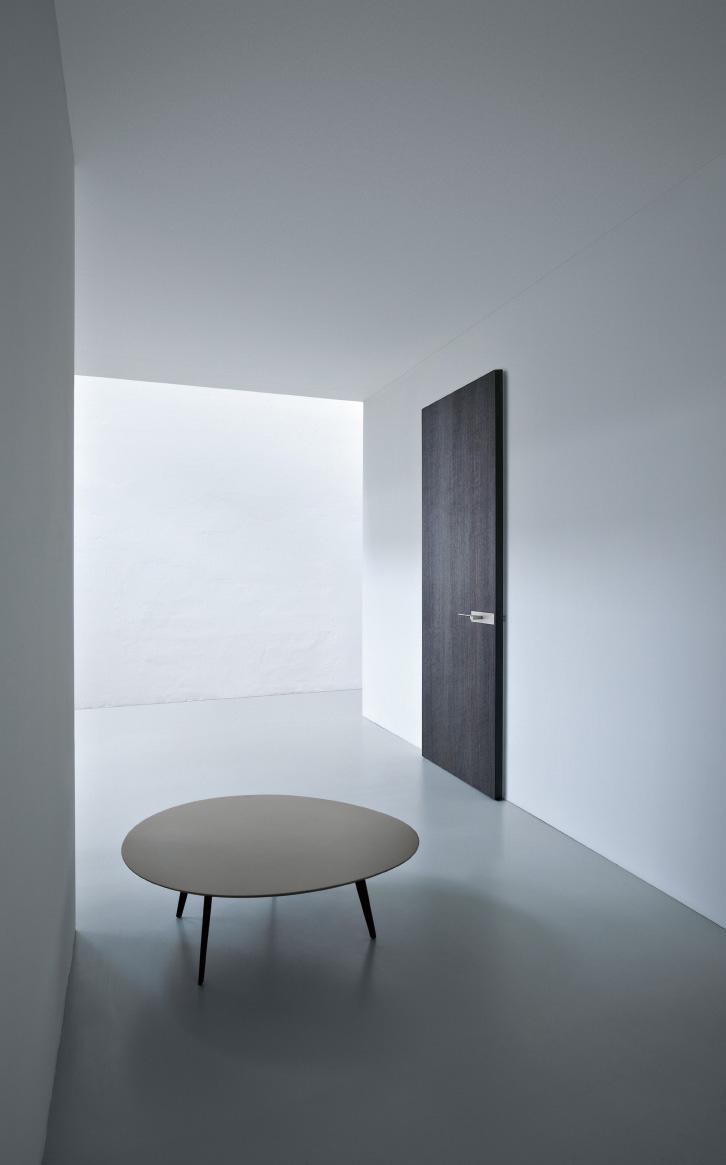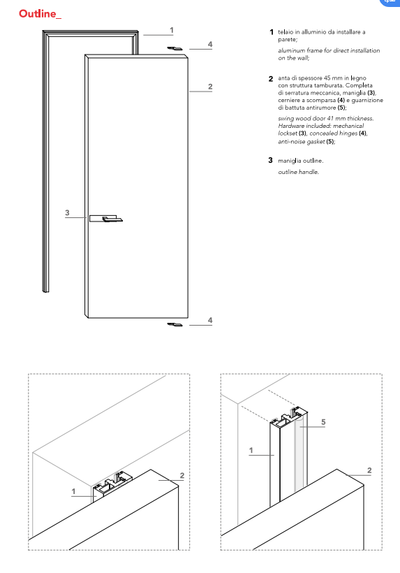 Swing wood door 45 thick. Mechanical lockset, concealed hinges and anti-noise gasket included. Aluminium frame for direct wall installation. Installation on pre-squared wall.