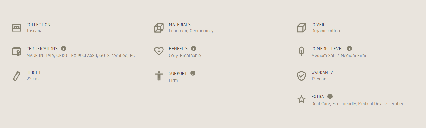 Cotton Caresse Dual 9 of the Toscana collection is dedicated to those seeking relaxation while also being respectful of the environment. Cotton Caresse offers an all-natural comfort and firm support at 23 cm of height. The GOTS certification issued by the Institute for Ethical and Environmental Certification is proof that the fabrics used to manufacture this line are made of organic materials, that are in full respect for man and the environment.