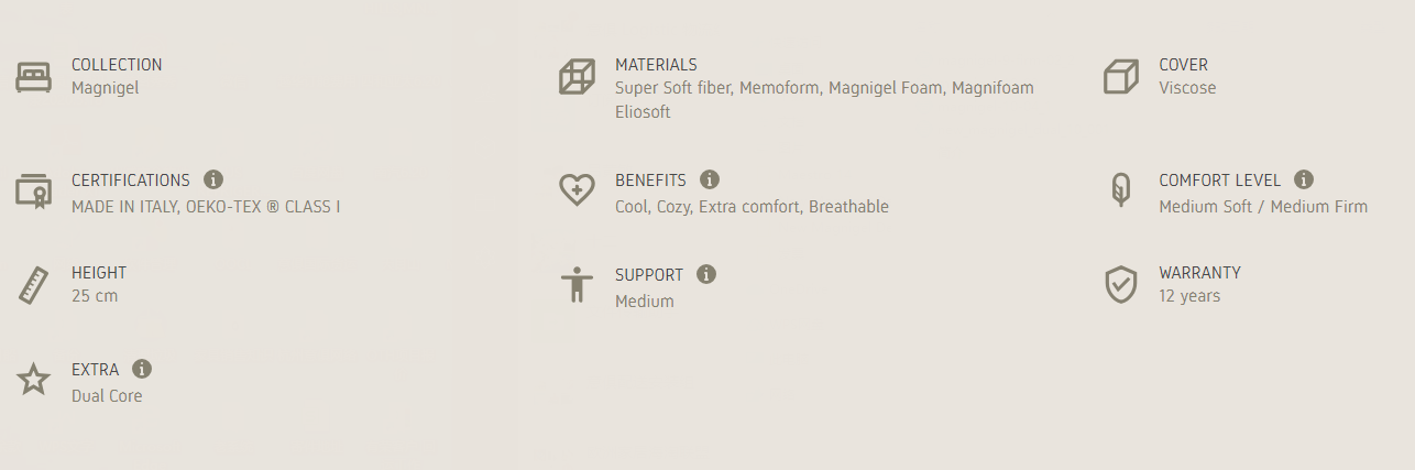 The New Magnigel Dual 10 of the Magnigel collection offers an unparalleled sensation of freshness, thanks to the innovative and breathable Magnigel Foam, which favors air circulation and maintains a constant microclimate between the body and the mattress. In addition, thanks to Dual Core technology, it ensures perfect comfort for the couple who have different needs when it comes to the type of support they need their body. Exceptional comfort in 25 cm of height.