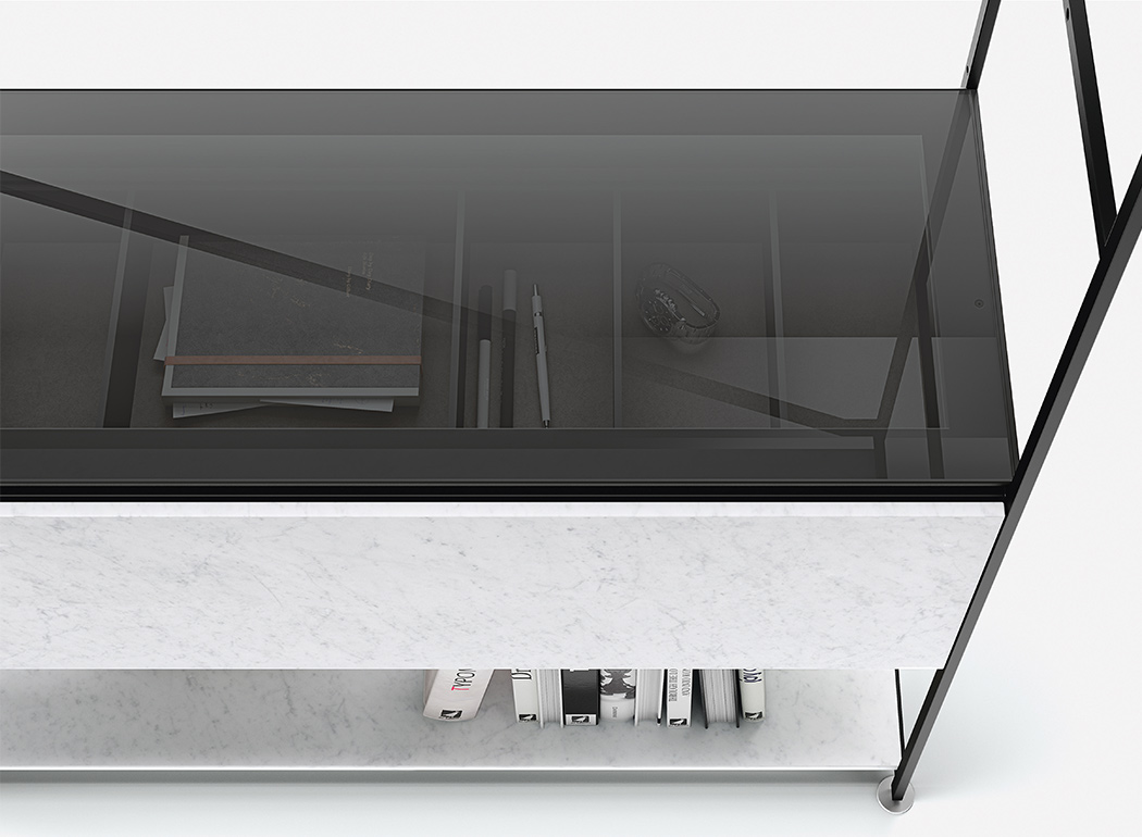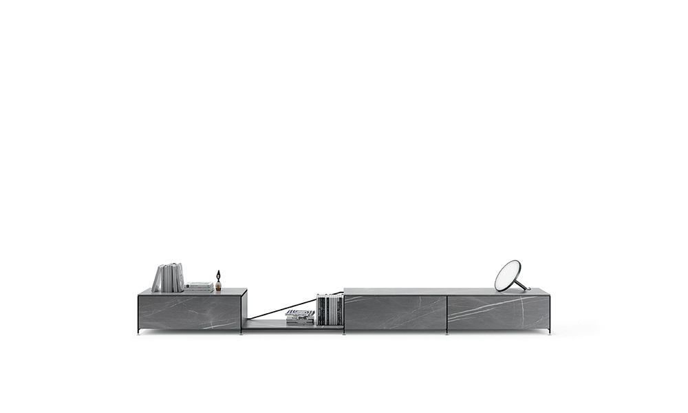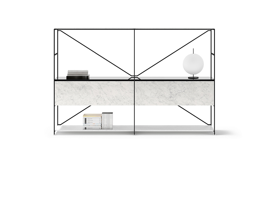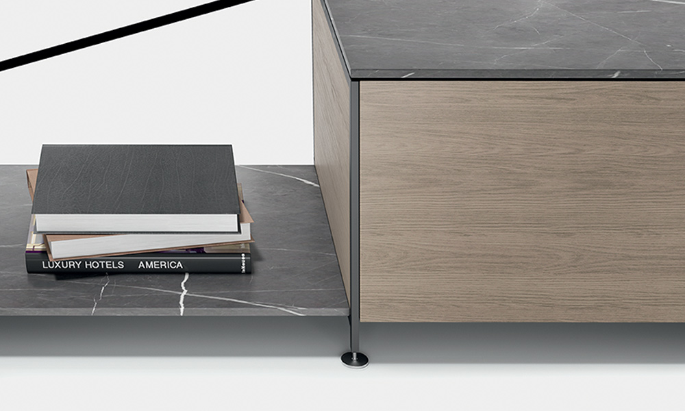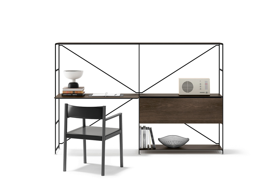 The modular R.I.G. shelving system is able to transform into any number of low profile furniture solutions suitable for the living room, study, entrance hall and dining room, including television stands, small tables for lighting, credenzas and low height bookcases. To simplify: uniqueness vs. coordinated. A methodized precise concept, modelled on basic needs and the environment. R.I.G. is a system and, as such, it is both starting and landing point. In the middle of the process, choices are dictated by creativity, taste and needs. In the living area, R.I.G. can be arranged into bookcases, tabletops, low furniture for audio and video systems. It can decorate the walls or left freestanding in a room. Combines smart quality of modularity with the aesthetic value of each independent elements, because of the unique structural lightness and materials that furnish the accessories: shelves in different depths and contained modules.