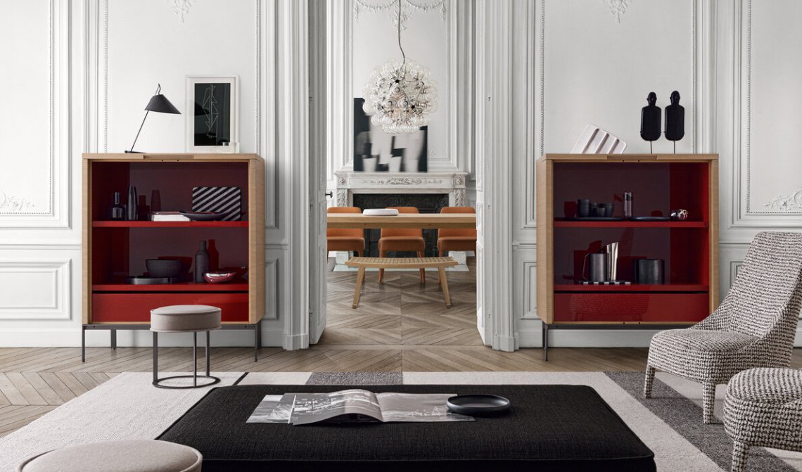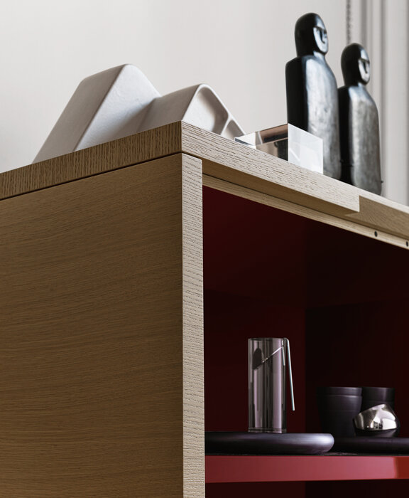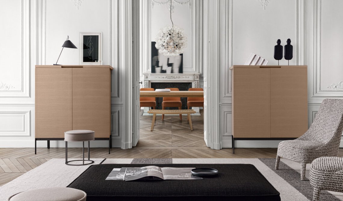 The common denominator in Mida storage units is a base-frame of steel profiles which supports various typologies of storage units: the smallest with feet are available in two heights, doors that rotate outwards 270° and different internal equipment; the low and long sideboard with rotating doors reveals either the two external compartments or the central compartments. Different types of wood available including a cut that reproduces the manual craftsmanship of sawn edges, leaves traces of processing that add value to its timeless elegance, a distinguishing feature for Maxalto. The internal frame of storage units are in wood or glossy finish.