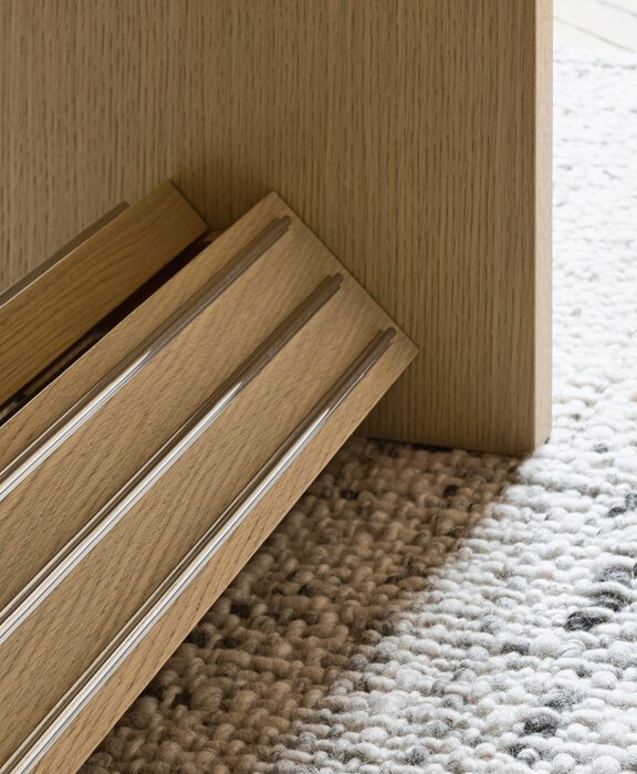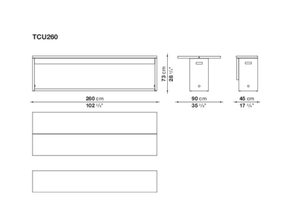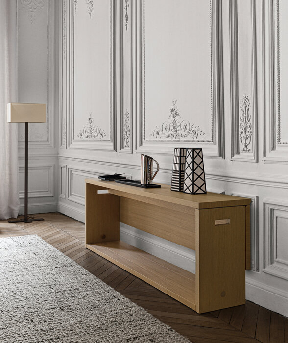 Practical, discreet, and suited to a variety of environments, Cuma is a starkly linear console table that can turn into a dining table for up to eight people. A simple mechanism opens and closes the top, performing its dual function with ease. The table comes in a single size, available in various wood finishes.