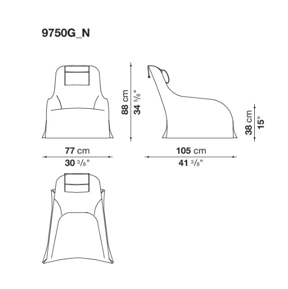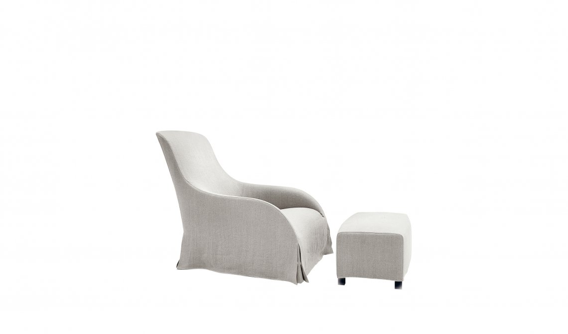 A modern interpretation of the more classic easy chair, Kalos comes both in leather and fabric upholstery. The latter can be stretched or formed by a slipcover hiding the feet or the revolving base. The footrest has two different heights. The feet are in solid wood available in several finishes.