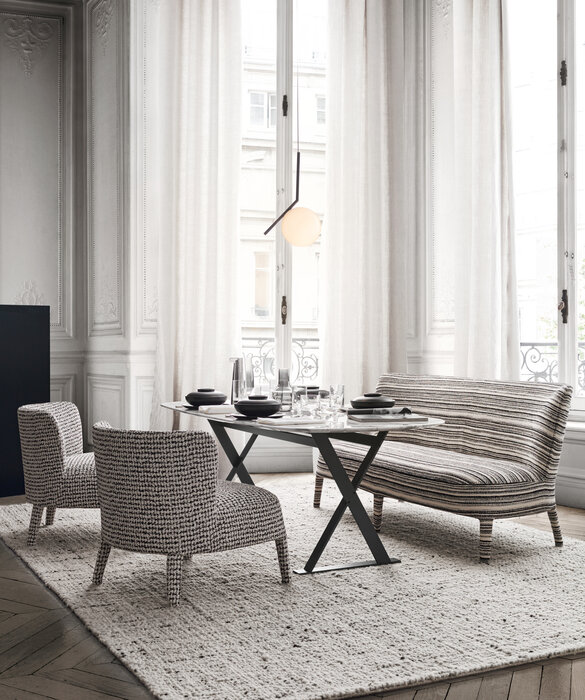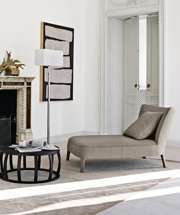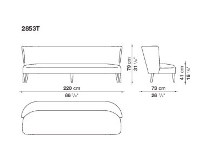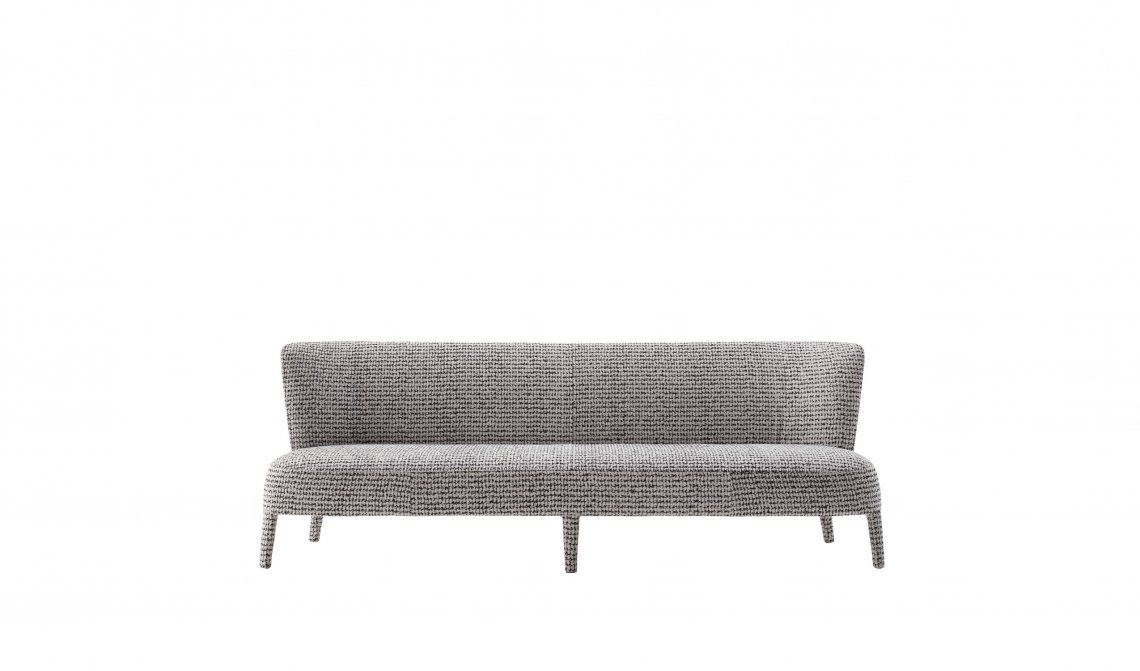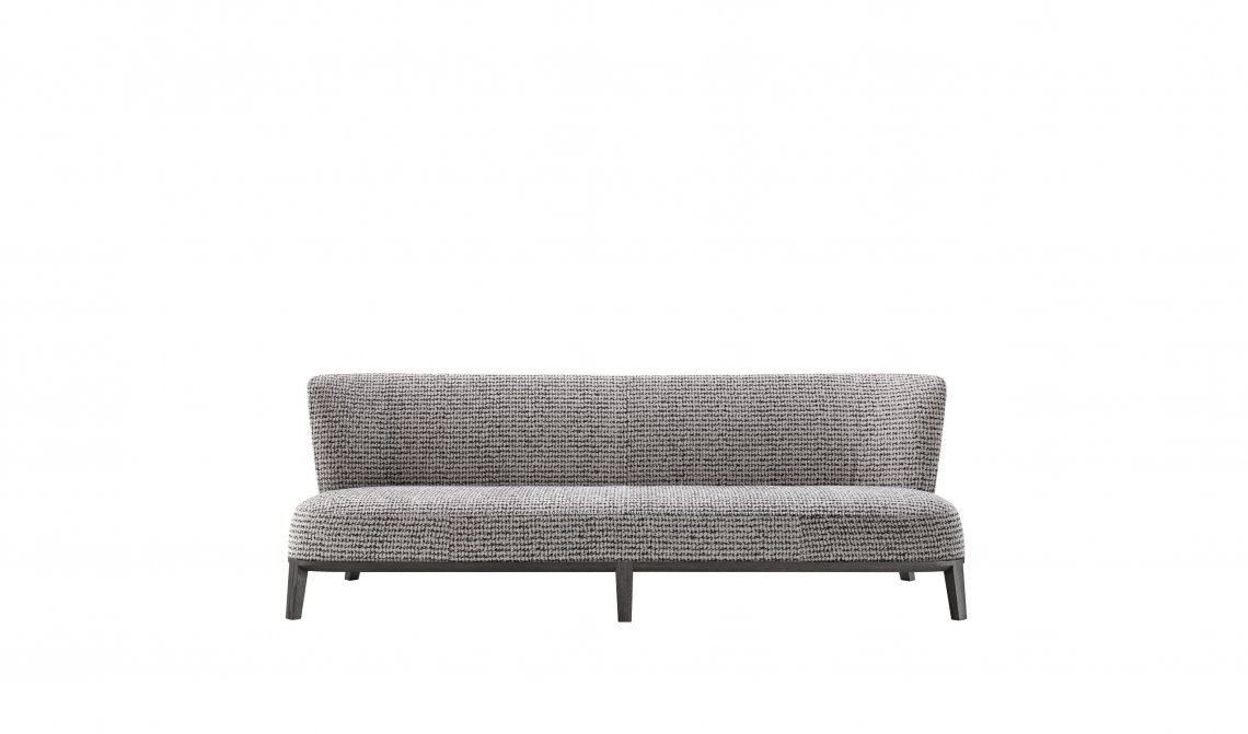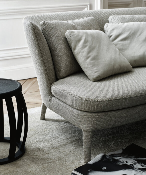Febo is a family of seats that carries with it the memory of a traditional design distinguished by a large enveloping back without armrests. The sofas, available as two-seater or three-seater, come in two sizes: a smaller one with low or high seat cushion and a larger one. The upholstery is in fabric or leather with visible blanket stitching. The base-frame and legs are in solid wood and are also available in a single-material version, covered in fabric or leather like the cushions.