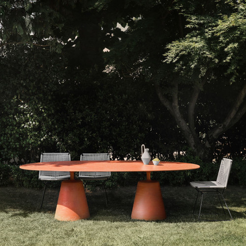 The iconic Rock Table, with its fluid and elegant silhouette, fits with great personality into a variety of outdoor settings, residential or public: gardens, terraces, dehors. In the new oval version, Rock Table becomes the perfect set for large outdoor gatherings, hosting up to 12 people.