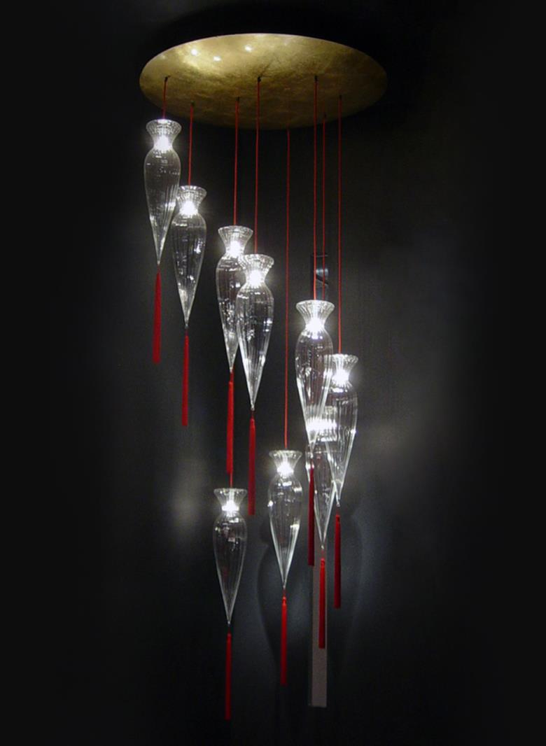 Suspension lamp. Hand blown titanium metallized glass dome with internal frosted bubble glass sculpture.