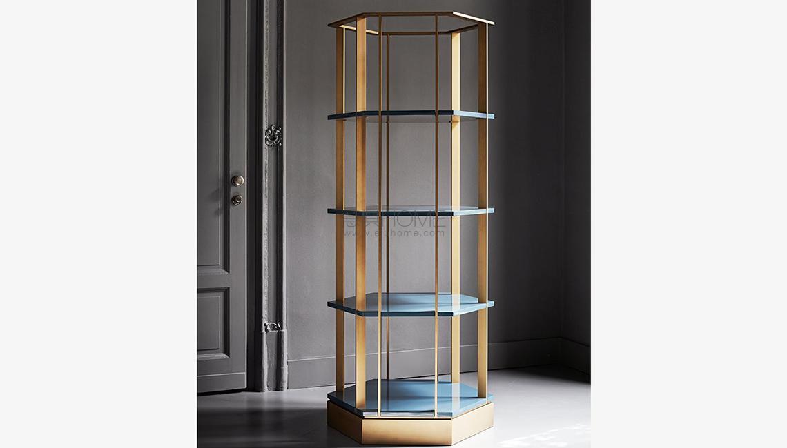 六角形書架,配有金屬框架,配有古銅色黃銅或黑色亞光漆