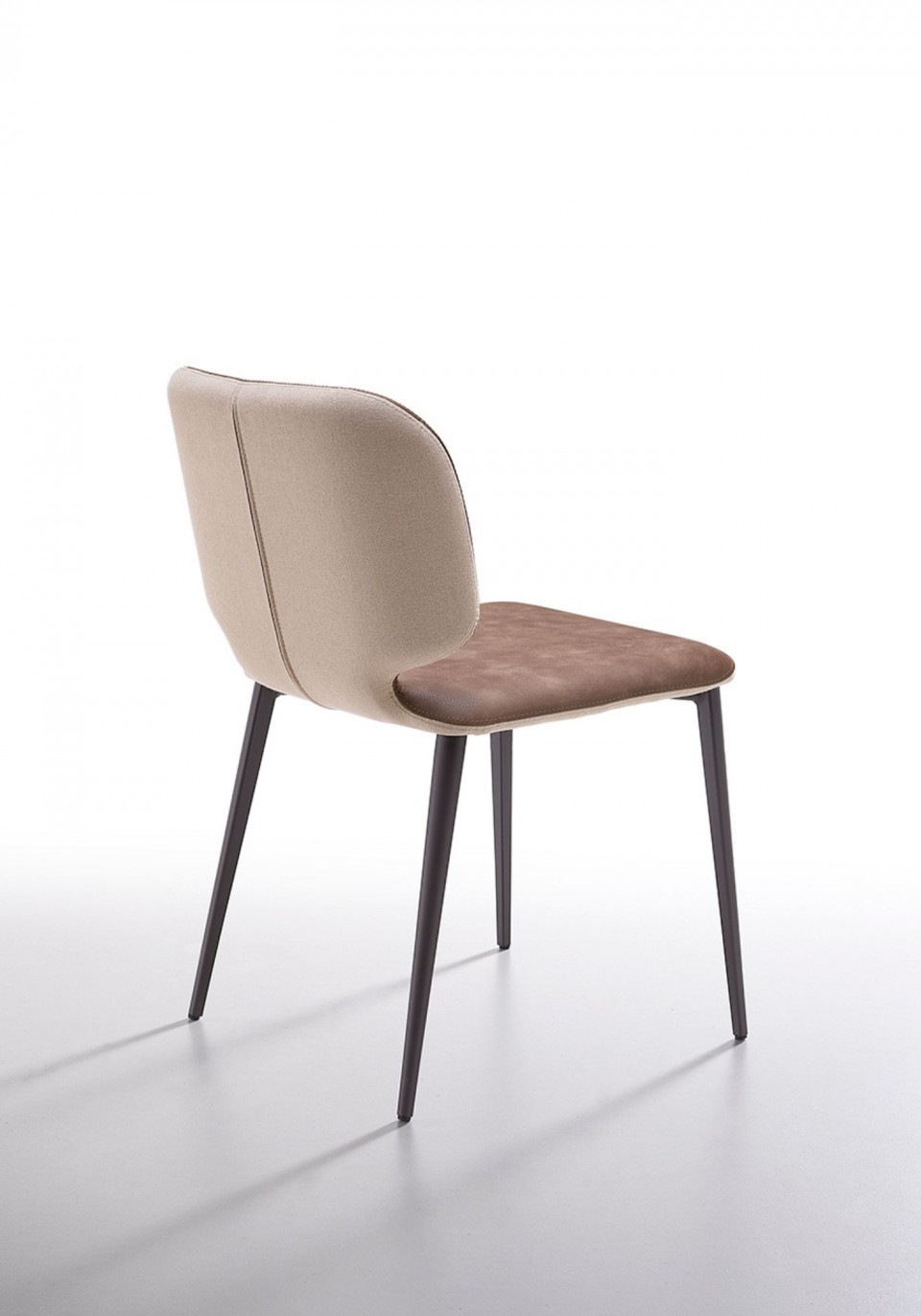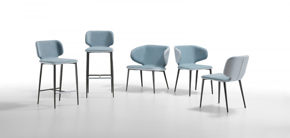 Armchair with four legs base in wood. Shell upholstered in fabric, leather or faux leather with possibility to upholster front and back face in contrasting materials or shades.