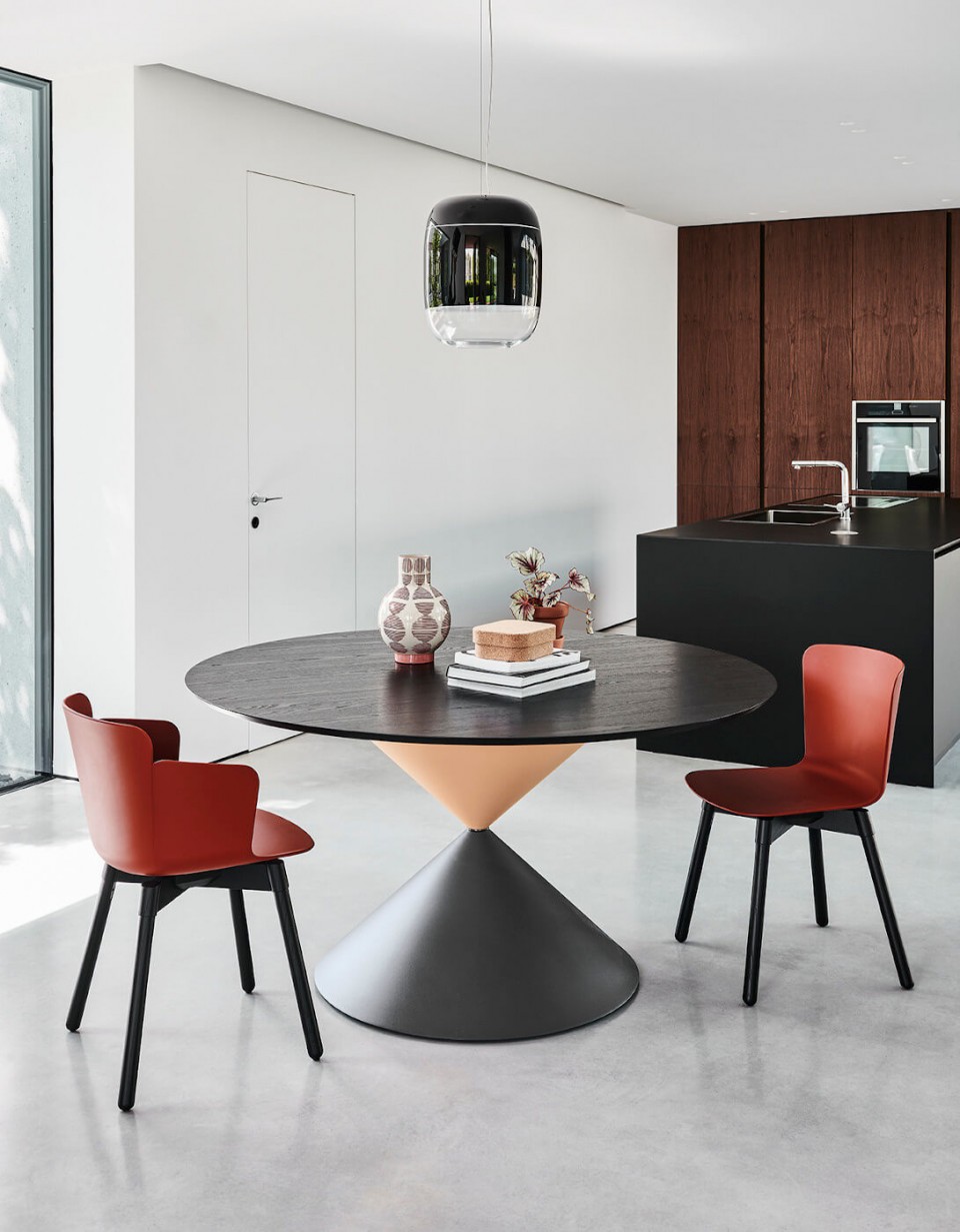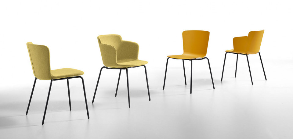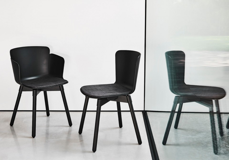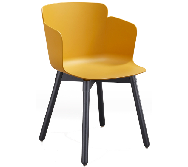 Armchair with four-legs wooden base. Polypropylene shell. Optional: fabric, leather or faux leather cushion.