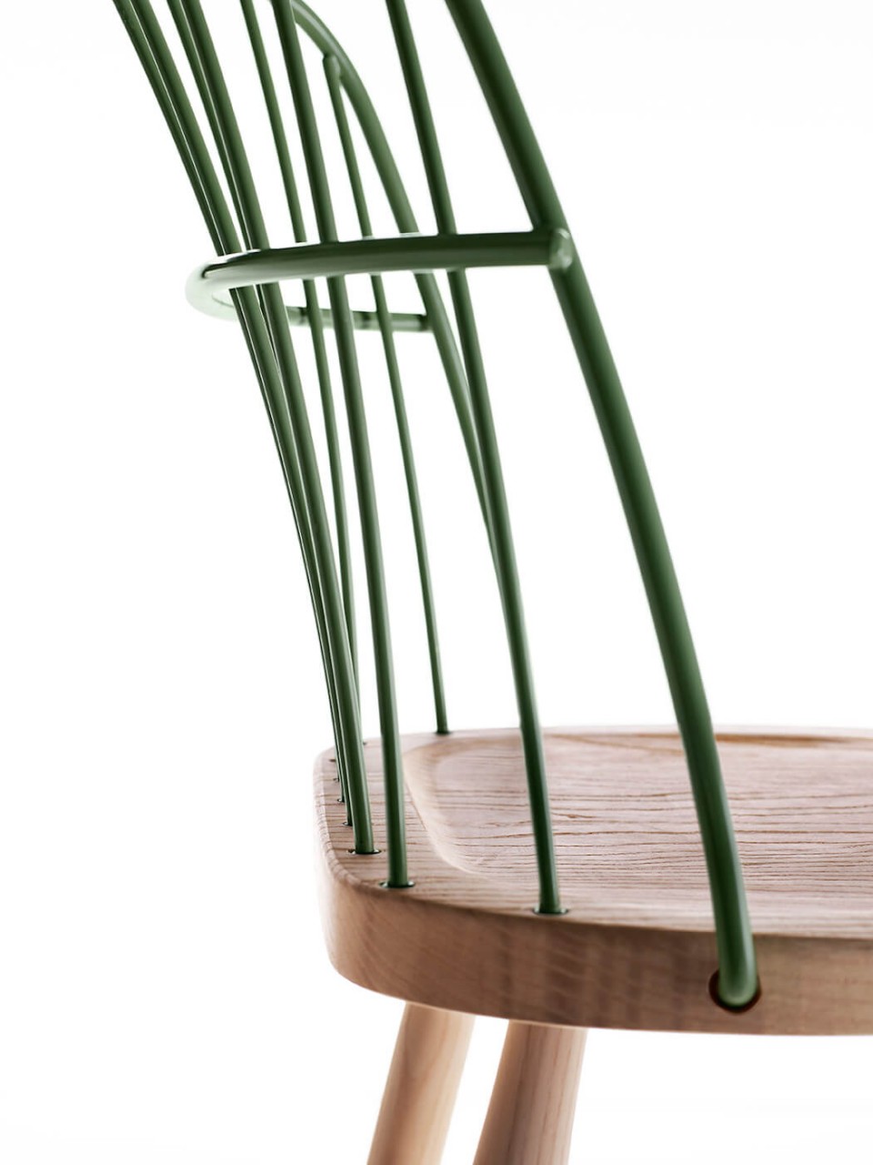 Strike chair with wooden frame and backrest in lacquered metal.