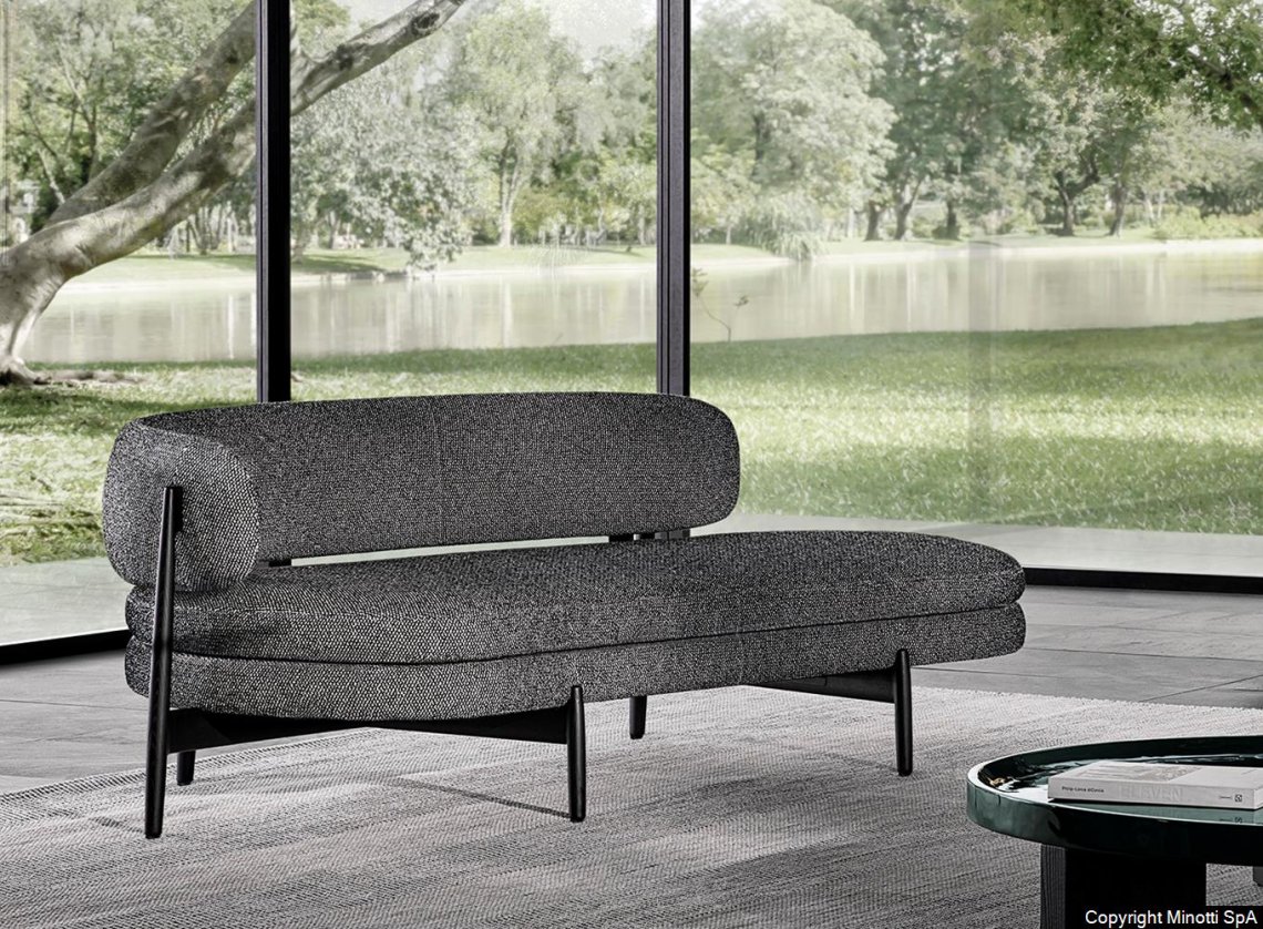 The architecture of this object, raised off the ground, rises above the seat to support and frame the backrest, lending an aerial elegance to this sofa proposed by Minotti for both residential and hospitality projects.