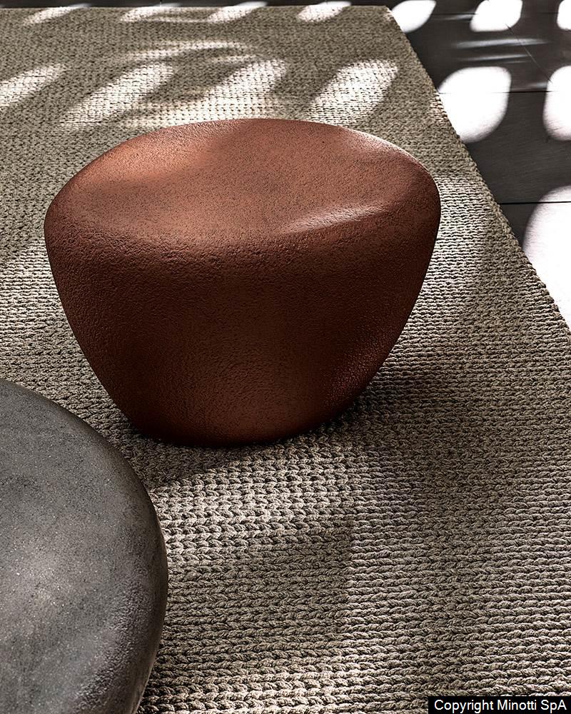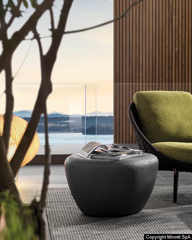 With its irregular shape and rounded corners, the Stony coffee table is inspired by pebbles, smoothed by the water of rivers, and it figures as a natural element in the landscape designed by the Outdoor Collection.